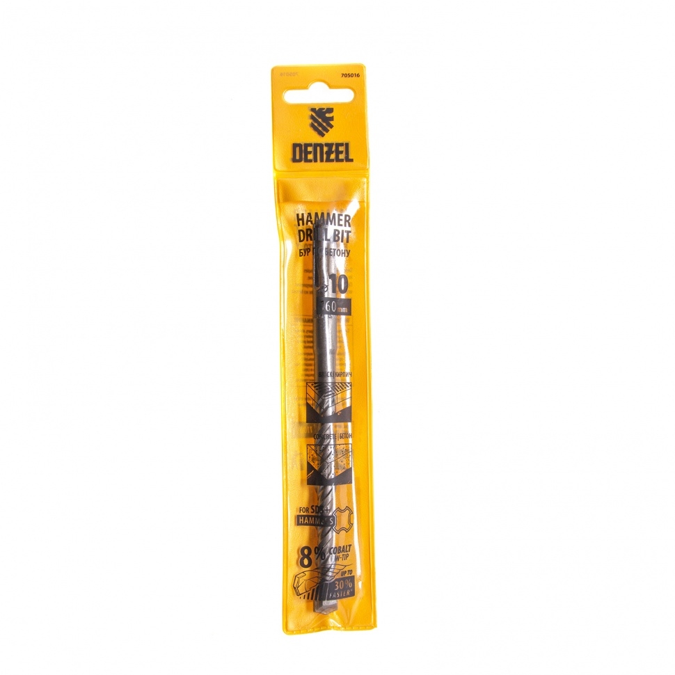 Бур по бетону Denzel арт. 705016 с хвостовиком SDS PLUS и двойной спиралью предназначен для сверления бетона, кирпича и камня. Он используется в качестве оснастки для перфораторов с патроном SDS Plus. Бур оптимален для проведения строительных, ремонтных, монтажных работ. Преимущества Продуманная конструкция — режущая твердосплавная пластина из стали ВК8 80-90 HRC с W-образной заточкой имеет высокий ресурс и способна сверлить отверстия до 30% быстрее, в том числе при работе с камнем. Прочность и износостойкость — рабочая часть из легированной стали 40Х выдерживает интенсивные и длительные ударные нагрузки, а также делает бур самым высокопроизводительным среди аналогов средней цены. Двойная спираль и канавка с дополнительным желобом — за счет более эффективного отвода шлама рабочая часть не перегревается, такая разработка позволяет продлить срок службы бура. Высокая технологичность — буры Denzel изготавливаются на производстве MAKITA, что гарантирует их качество и эффективность сверления. Бур поставляется в у