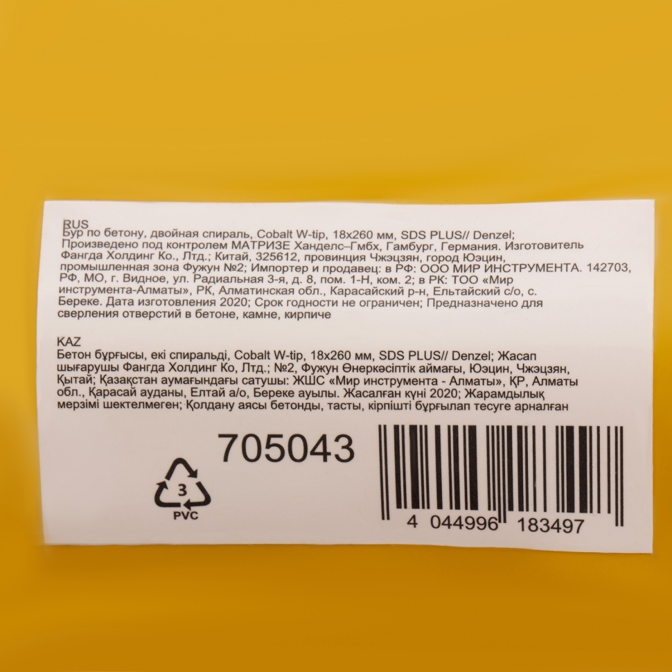 Бур по бетону Denzel арт. 705043 с хвостовиком SDS PLUS и двойной спиралью предназначен для сверления бетона, кирпича и камня. Он используется в качестве оснастки для перфораторов с патроном SDS Plus. Бур оптимален для проведения строительных, ремонтных, монтажных работ. Преимущества Продуманная конструкция — режущая твердосплавная пластина из стали ВК8 80-90 HRC с W-образной заточкой имеет высокий ресурс и способна сверлить отверстия до 30% быстрее, в том числе при работе с камнем. Прочность и износостойкость — рабочая часть из легированной стали 40Х выдерживает интенсивные и длительные ударные нагрузки, а также делает бур самым высокопроизводительным среди аналогов средней цены. Двойная спираль и канавка с дополнительным желобом — за счет более эффективного отвода шлама рабочая часть не перегревается, такая разработка позволяет продлить срок службы бура. Высокая технологичность — буры Denzel изготавливаются на производстве MAKITA, что гарантирует их качество и эффективность сверления. Бур поставляется в у