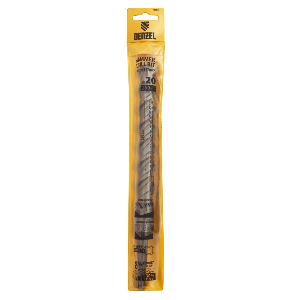 Бур по бетону Denzel арт. 705047 с хвостовиком SDS PLUS и двойной спиралью предназначен для сверления бетона, кирпича и камня. Он используется в качестве оснастки для перфораторов с патроном SDS Plus. Бур оптимален для проведения строительных, ремонтных, монтажных работ. Преимущества Продуманная конструкция — режущая твердосплавная пластина из стали ВК8 80-90 HRC с W-образной заточкой имеет высокий ресурс и способна сверлить отверстия до 30% быстрее, в том числе при работе с камнем. Прочность и износостойкость — рабочая часть из легированной стали 40Х выдерживает интенсивные и длительные ударные нагрузки, а также делает бур самым высокопроизводительным среди аналогов средней цены. Двойная спираль и канавка с дополнительным желобом — за счет более эффективного отвода шлама рабочая часть не перегревается, такая разработка позволяет продлить срок службы бура. Высокая технологичность — буры Denzel изготавливаются на производстве MAKITA, что гарантирует их качество и эффективность сверления. Бур поставляется в у