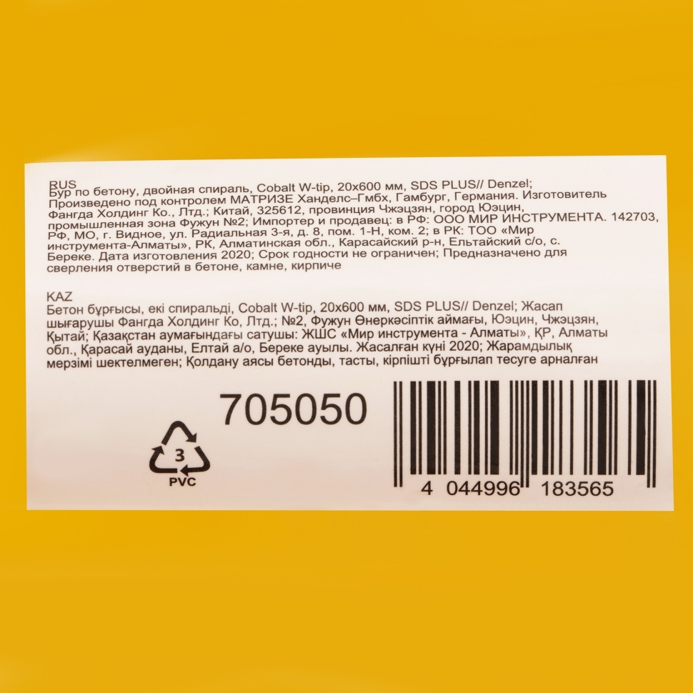 Бур по бетону Denzel арт. 705050 с хвостовиком SDS PLUS и двойной спиралью предназначен для сверления бетона, кирпича и камня. Он используется в качестве оснастки для перфораторов с патроном SDS Plus. Бур оптимален для проведения строительных, ремонтных, монтажных работ. Преимущества Продуманная конструкция — режущая твердосплавная пластина из стали ВК8 80-90 HRC с W-образной заточкой имеет высокий ресурс и способна сверлить отверстия до 30% быстрее, в том числе при работе с камнем. Прочность и износостойкость — рабочая часть из легированной стали 40Х выдерживает интенсивные и длительные ударные нагрузки, а также делает бур самым высокопроизводительным среди аналогов средней цены. Двойная спираль и канавка с дополнительным желобом — за счет более эффективного отвода шлама рабочая часть не перегревается, такая разработка позволяет продлить срок службы бура. Высокая технологичность — буры Denzel изготавливаются на производстве MAKITA, что гарантирует их качество и эффективность сверления. Бур поставляется в у
