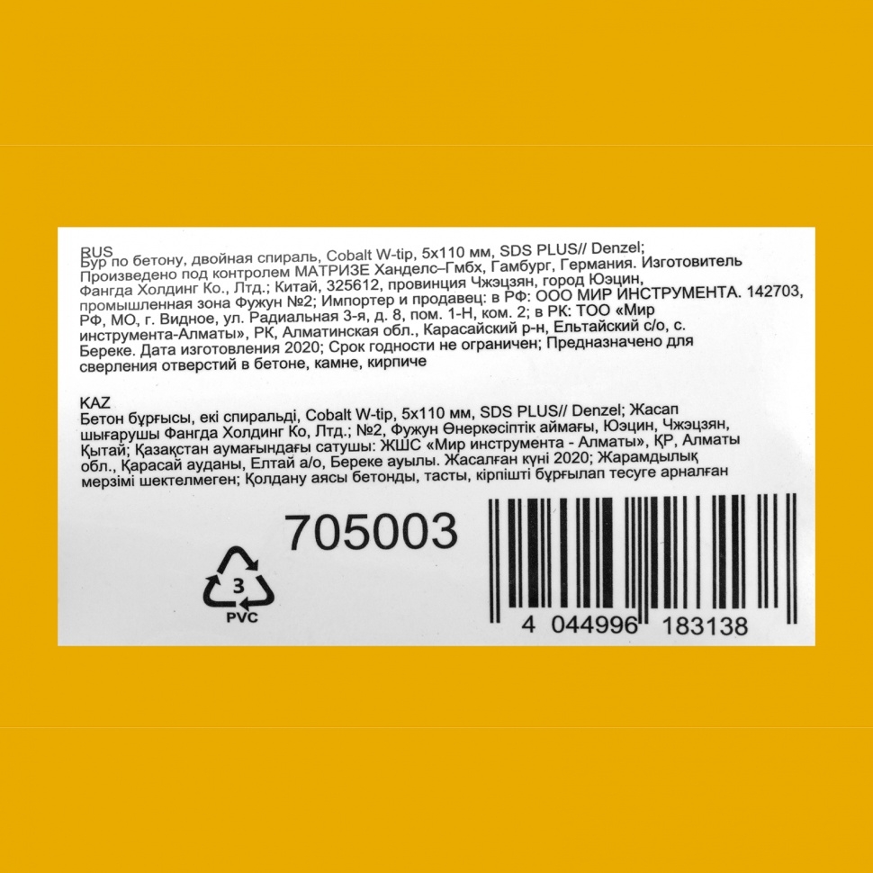 Бур по бетону Denzel арт. 705003 с хвостовиком SDS PLUS и двойной спиралью предназначен для сверления бетона, кирпича и камня. Он используется в качестве оснастки для перфораторов с патроном SDS Plus. Бур оптимален для проведения строительных, ремонтных, монтажных работ. Преимущества Продуманная конструкция — режущая твердосплавная пластина из стали ВК8 80-90 HRC с W-образной заточкой имеет высокий ресурс и способна сверлить отверстия до 30% быстрее, в том числе при работе с камнем. Прочность и износостойкость — рабочая часть из легированной стали 40Х выдерживает интенсивные и длительные ударные нагрузки, а также делает бур самым высокопроизводительным среди аналогов средней цены. Двойная спираль и канавка с дополнительным желобом — за счет более эффективного отвода шлама рабочая часть не перегревается, такая разработка позволяет продлить срок службы бура. Высокая технологичность — буры Denzel изготавливаются на производстве MAKITA, что гарантирует их качество и эффективность сверления. Бур поставляется в у