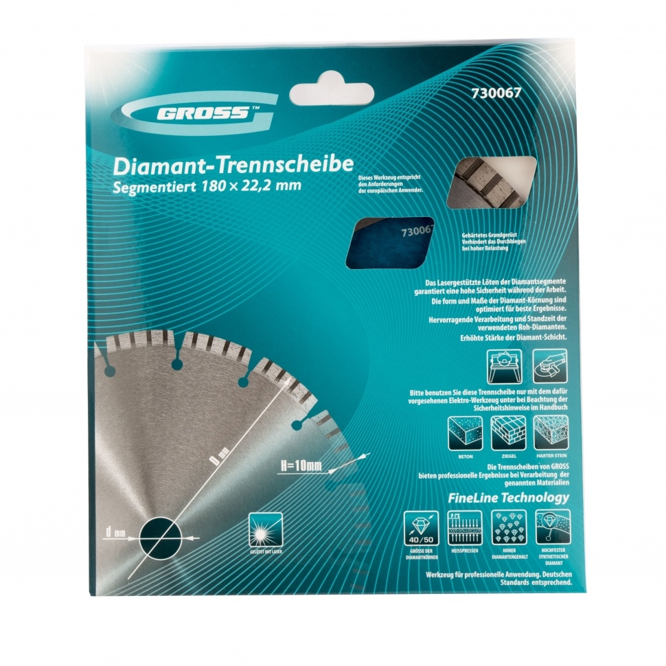 Алмазный диск Gross ф180х22,2 мм 7300067 с лазерной приваркой турбо-сегментов предназначен для сухого резания бетона, в том числе свежего, слабоармированного железобетона, кирпича, песчаника и гранита. Посадочный диаметр 22,2 мм позволяет использовать диск в качестве расходного инструмента для УШМ. Турбо-сегменты обеспечивают быстрое сухое резание без необходимости водяного охлаждения. За счет оптимально подобранной связки диск выдерживает перегрузки и подходит как для интенсивного бытового, так и для профессионального применения, когда требуется выполнить большой объем работ.Преимущества Турбо-сегментная форма &mdash диск универсален по своему применению, позволяет быстро резать материалы, в т.ч. слабоармированный бетон без риска деформации. Лазерная приварка турбо-сегментов &mdash режущий алмазный слой прочно фиксируются на корпусе, такая технология изготовления гарантирует надежность диска и высокую стойкость к нагрузкам. Ширина алмазного слоя 10 мм &mdash диск гарантирует высокую производительность выполн
