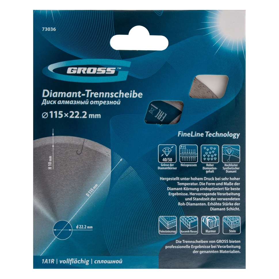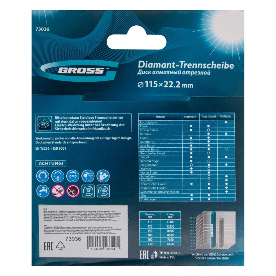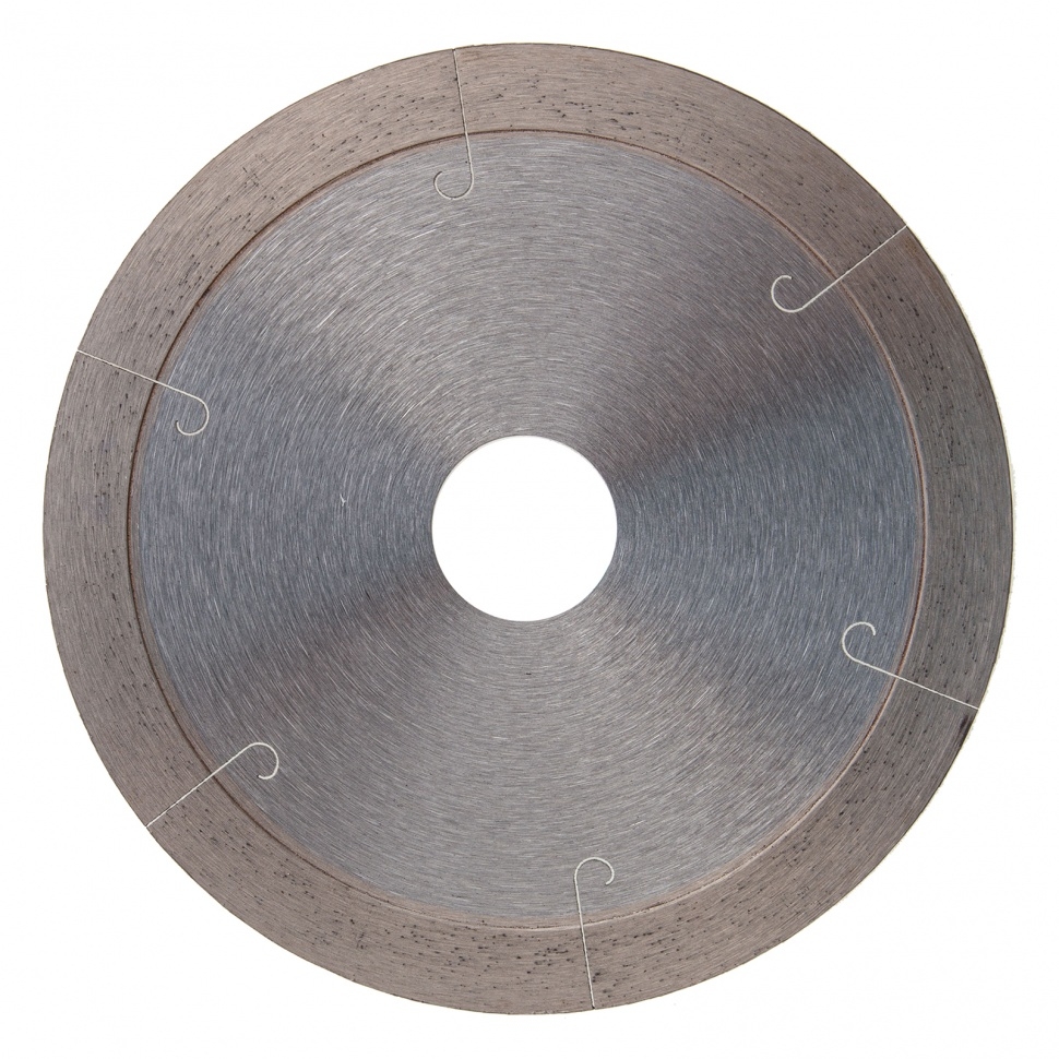 Сплошной алмазный диск Gross ф115х22,2 мм 73036 с лазерной перфорацией для мокрого резания используется в качестве расходника на УШМ или плиткорезах с посадочным размером 22,2 мм. Оптимальное соотношение серебра, кобальта и других качественных компонентов в металлической связке позволяет работать с гранитом, керамикой, керамогранитом, мрамором, натуральным и искусственным камнем. Метод мокрого шлифования подразумевает использование водяного охлаждения, что способствует снижению перегрева и эффективному отводу пыли.Преимущества Диск имеет большой ресурс, надежность и может использоваться профессионально, т.к. изготовлен по технологии горячего прессования. За счет сплошного типа диска обеспечивается качественный ровный срез без риска образования сколов. Высокая концентрация и крупный размер алмазов 40-50 мкм повышают скорость реза. Лазерная перфорация усиливает охлаждение диска, а значит, он легко выдерживает интенсивное использование. Режущая часть шириной 10 мм гарантирует стабильно высокую производительность