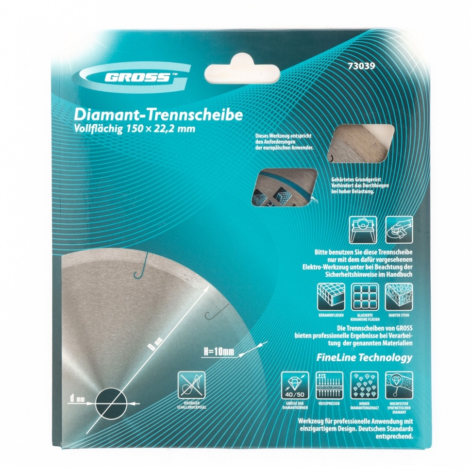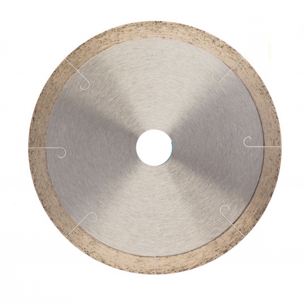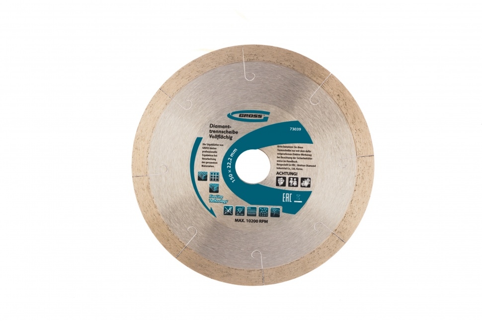 Сплошной алмазный диск Gross ф150х22,2 мм 73039 с лазерной перфорацией для мокрого резания используется в качестве расходника на УШМ или плиткорезах с посадочным размером 22,2 мм. Оптимальное соотношение серебра, кобальта и других качественных компонентов в металлической связке позволяет работать с гранитом, керамикой, керамогранитом, мрамором, натуральным и искусственным камнем. Метод мокрого шлифования подразумевает использование водяного охлаждения, что способствует снижению перегрева и эффективному отводу пыли.Преимущества Диск имеет большой ресурс, надежность и может использоваться профессионально, т.к. изготовлен по технологии горячего прессования. За счет сплошного типа диска обеспечивается качественный ровный срез без риска образования сколов. Высокая концентрация и крупный размер алмазов 40-50 мкм повышают скорость реза. Лазерная перфорация усиливает охлаждение диска, а значит, он легко выдерживает интенсивное использование. Режущая часть шириной 10 мм гарантирует стабильно высокую производительность