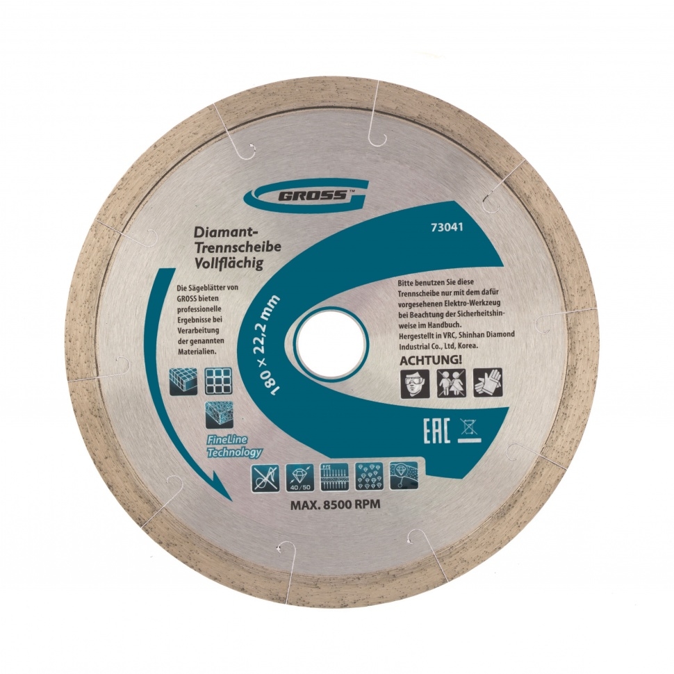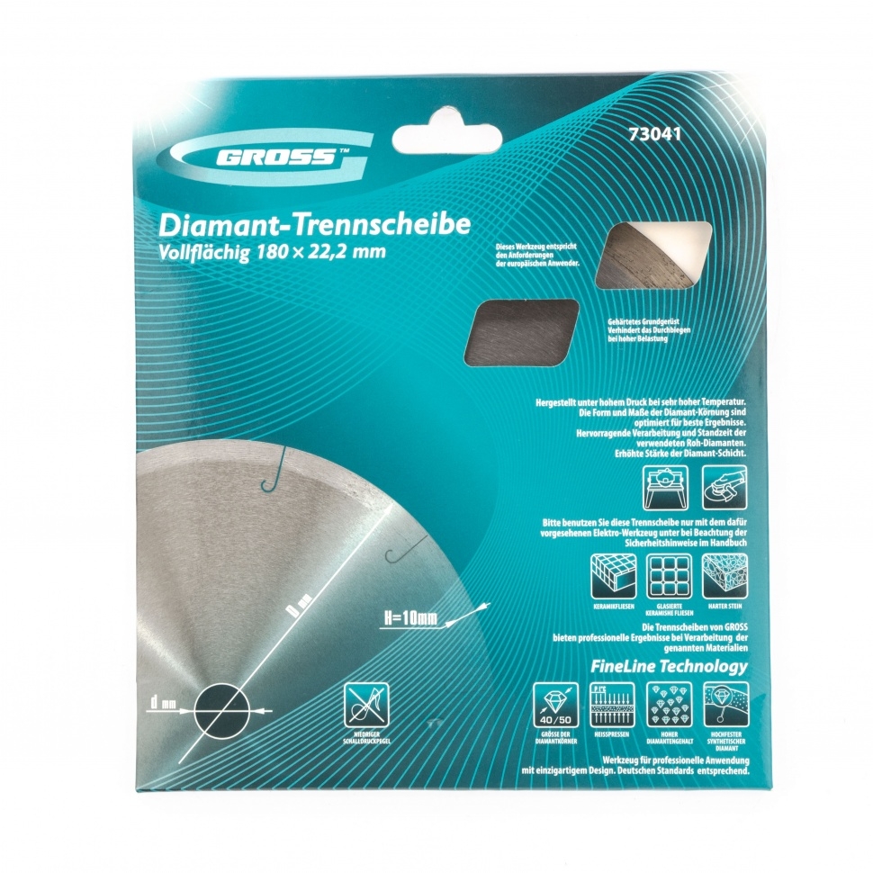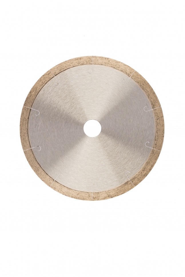 Сплошной алмазный диск Gross ф180х22,2 мм 73041 с лазерной перфорацией для мокрого резания используется в качестве расходника на УШМ или плиткорезах с посадочным размером 22,2 мм. Оптимальное соотношение серебра, кобальта и других качественных компонентов в металлической связке позволяет работать с гранитом, керамикой, керамогранитом, мрамором, натуральным и искусственным камнем. Метод мокрого шлифования подразумевает использование водяного охлаждения, что способствует снижению перегрева и эффективному отводу пыли.Преимущества Диск имеет большой ресурс, надежность и может использоваться профессионально, т.к. изготовлен по технологии горячего прессования. За счет сплошного типа диска обеспечивается качественный ровный срез без риска образования сколов. Высокая концентрация и крупный размер алмазов 40-50 мкм повышают скорость реза. Лазерная перфорация усиливает охлаждение диска, а значит, он легко выдерживает интенсивное использование. Режущая часть шириной 10 мм гарантирует стабильно высокую производительность
