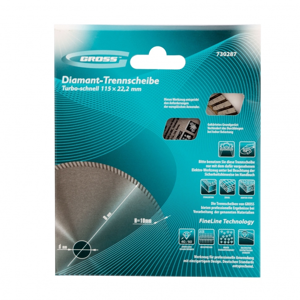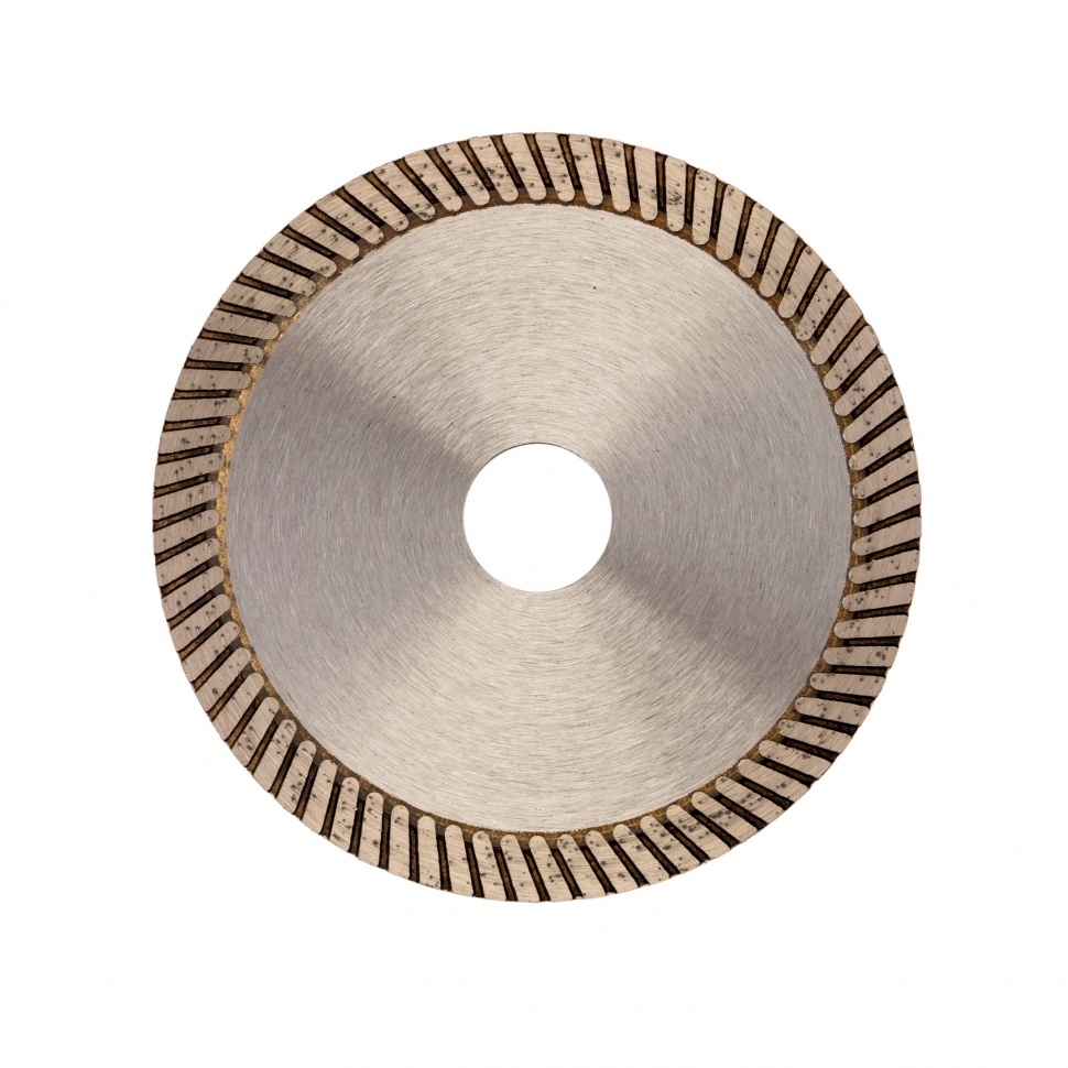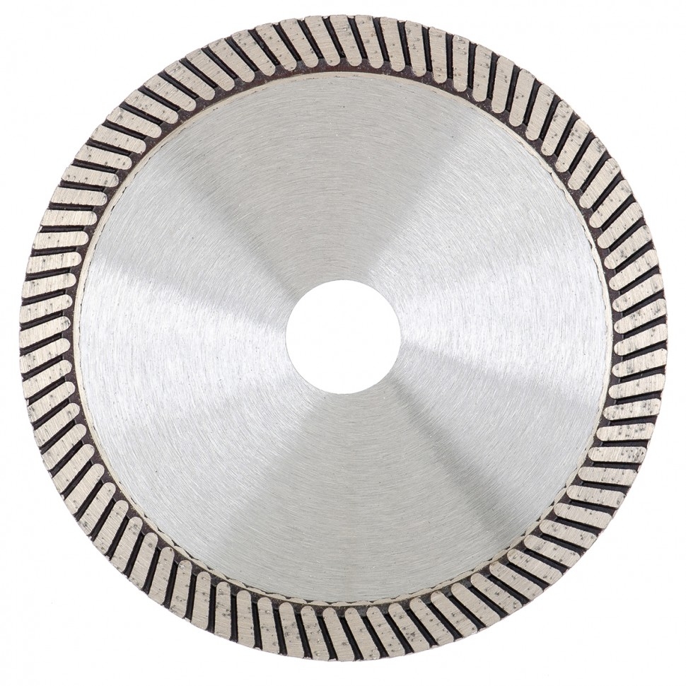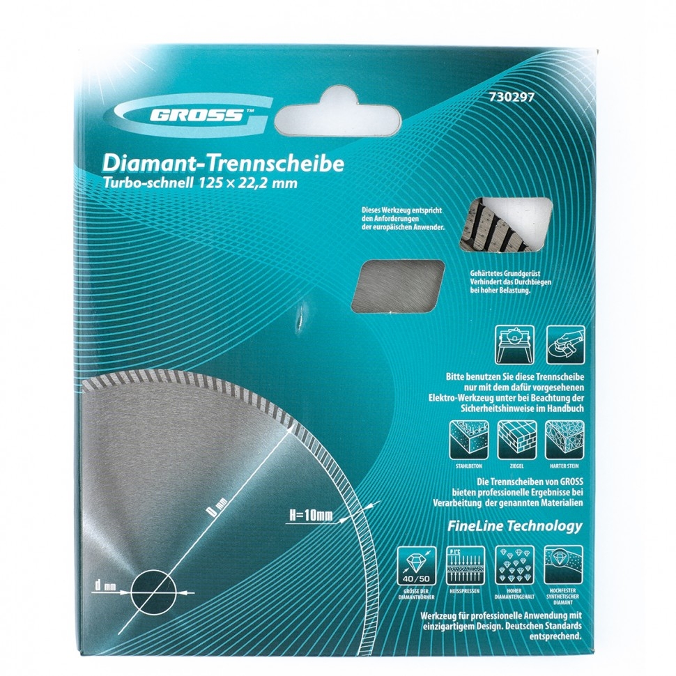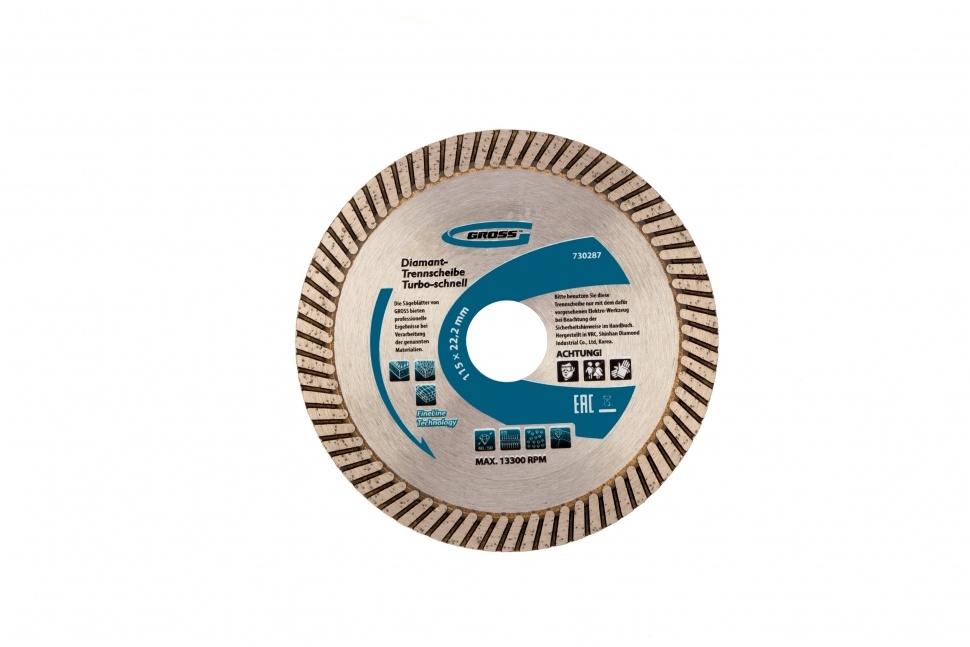 Алмазный диск Gross ф125х22,2мм 730297, турбо, позволяет осуществлять сухое резание бетона, в том числе недавно уложенного, среднеармированного железобетона, кирпича, гранита, камня, песчаника с помощью УШМ. Инструмент подходит для алмазной резки нескольких типов материалов благодаря турбированной рабочей части и оптимальному соотношению компонентов в металлической связке. Высокое качество диска делает его подходящим для профессионального применения.Преимущества Турбированная форма обеспечивает быструю алмазную резку сухим способом, прибегать к водяному охлаждению не нужно. Изготовление диска путем горячего прессования позволяет повысить его надежность и ресурс. Алмазный диск быстро режет материалы и отличается износостойкостью благодаря высокой концентрации алмазов и крупному размеру зерен 40-50 мкм. Широкая рабочая часть (10 мм) позволяет повысить производительность работ. Высококачественная связка из серебра, кобальта и других компонентов со временем истирается, раскрывая новый слой алмазов, поэтому диск