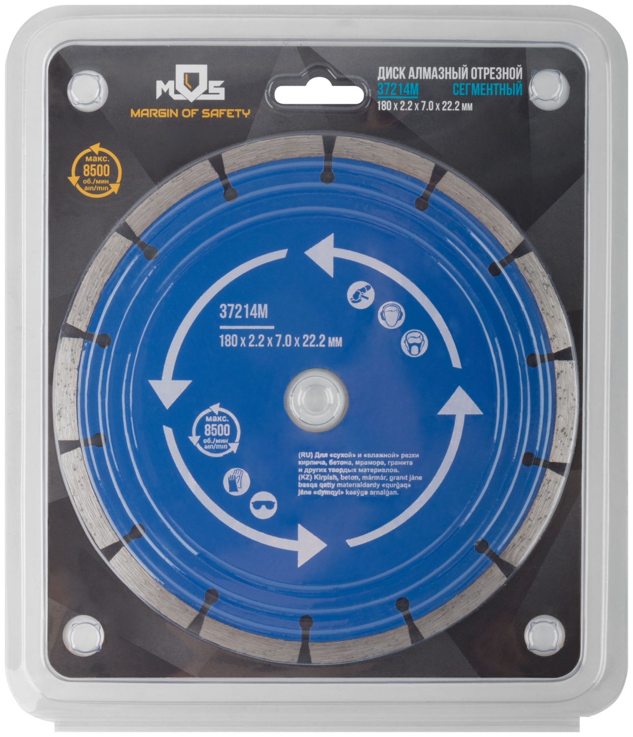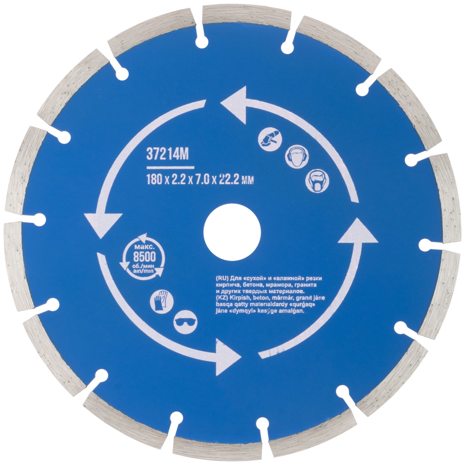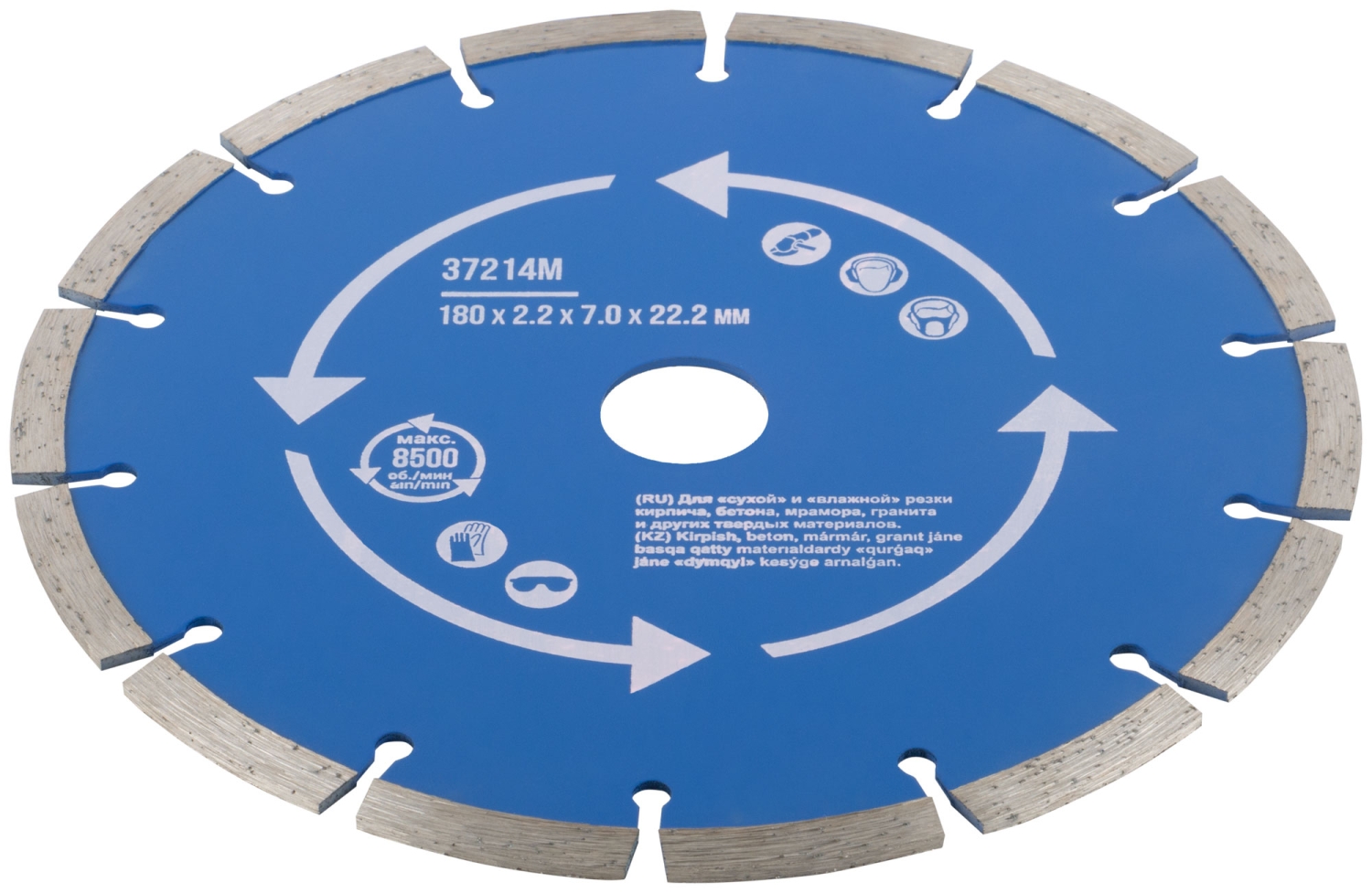 Сегментный. Для использования с УШМ . Посадочный диаметр 22,2мм. Для "сухой" и "влажной"резки кирпича, бетона, мрамора,гранита и других твердых материалов. Сегментная режущая кромка обеспечивает охлаждение диска в процессе работы, предотвращая его перегрев. Материал: инструментальная сталь, режущая кромка-расплав с техническими алмазами. Уп: Блистер