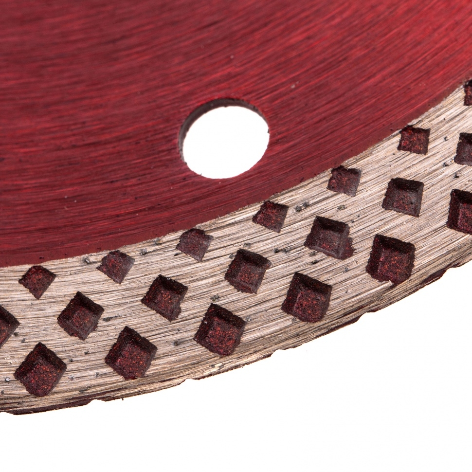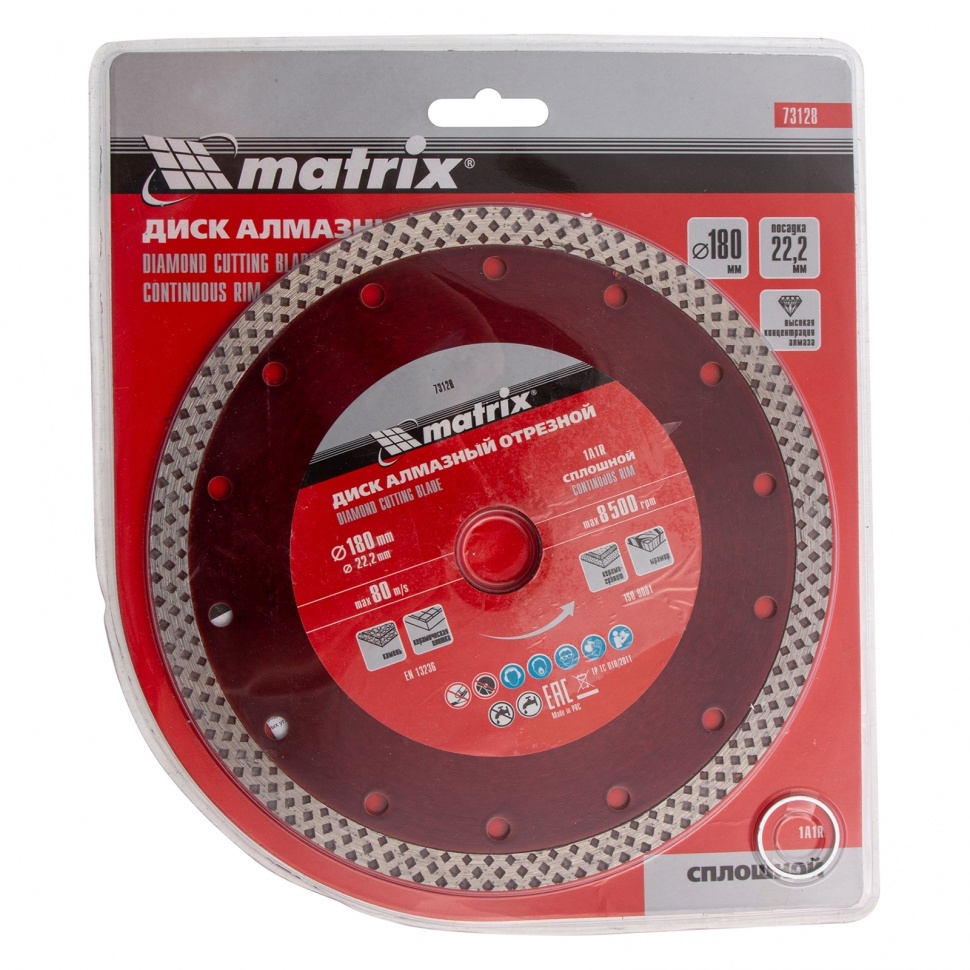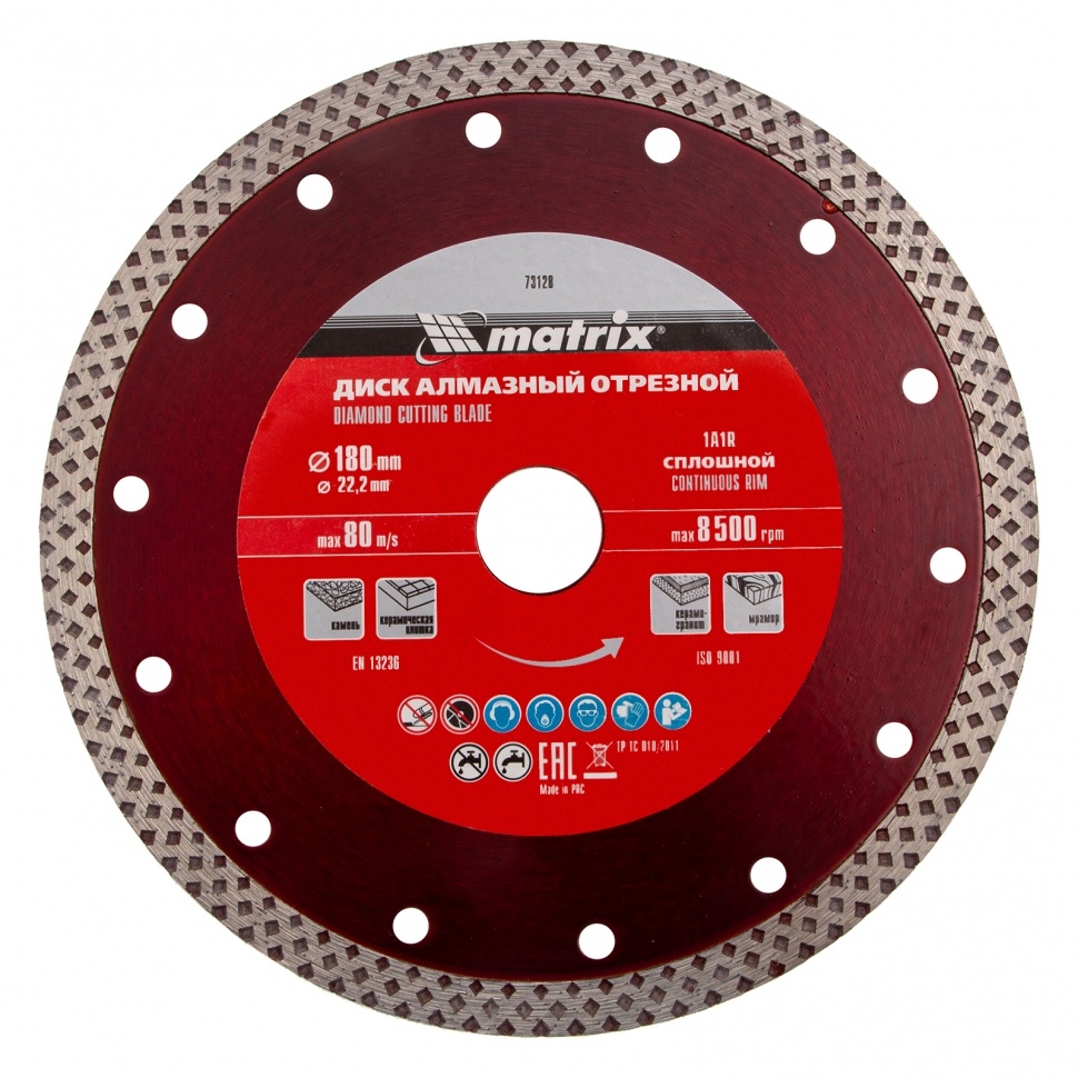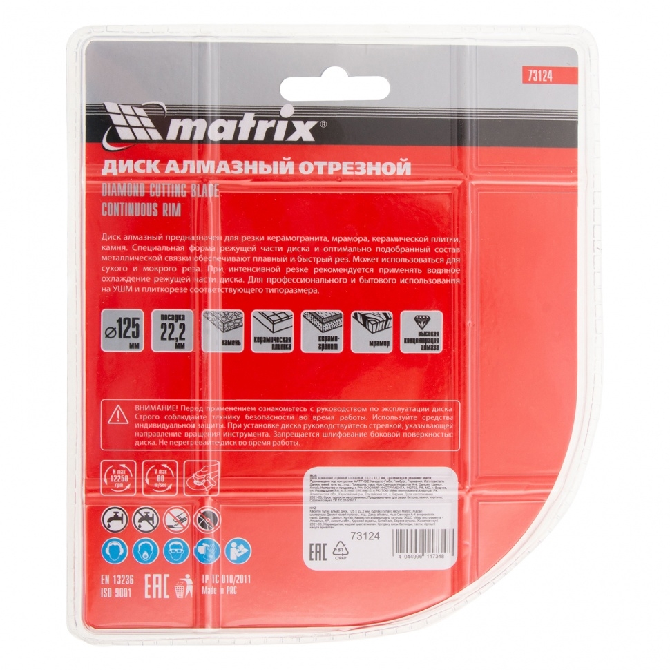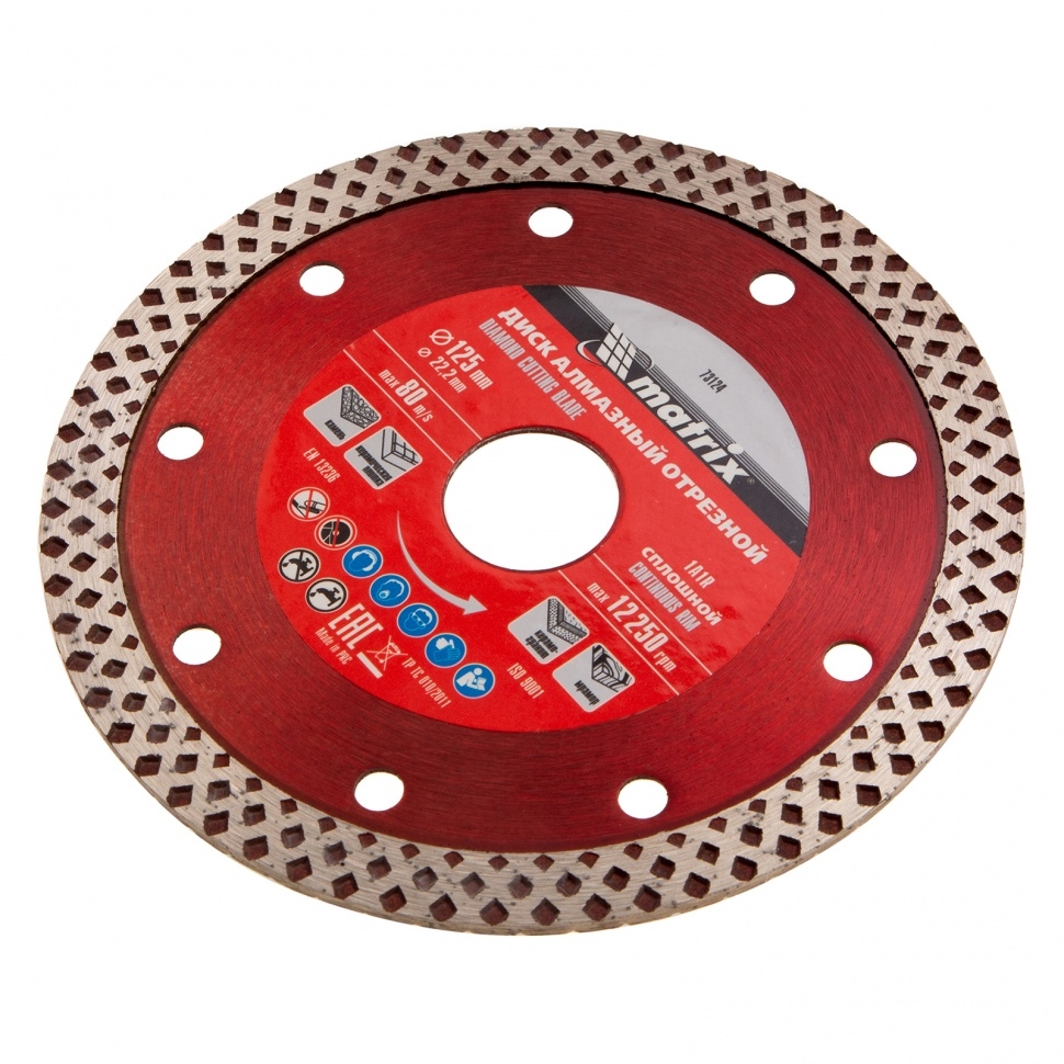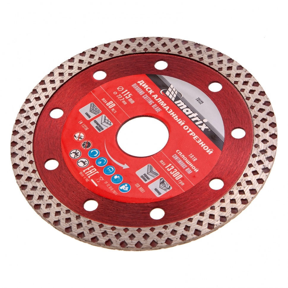 Отрезной алмазный диск Matrix 73122, сплошной, 115 мм &mdash оснастка для болгарок и плиткорезов с диаметром вала 22,2 мм. Он применяется для резки мрамора, искусственного и натурального камня, керамогранитной и керамической плитки. Использование без подачи воды расширяет возможности инструмента. Диск предназначен для бытового применения. Рекомендуется использовать водяное охлаждение для увеличения ресурса диска.Преимущества Благодаря высокой концентрации алмазов срез получается чистым и ровным. Режущая кромка шириной 10 мм способствует повышению производительности. Отверстия в корпусе диска способствуют активному охлаждению, что позволяет использовать диск для сухой резки. Диск выполнен нанесен методом холодного прессования, поэтому устойчив к механическим нагрузкам.