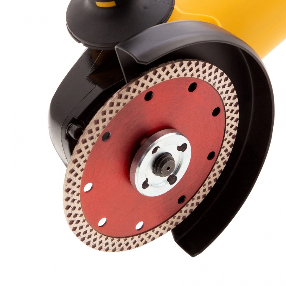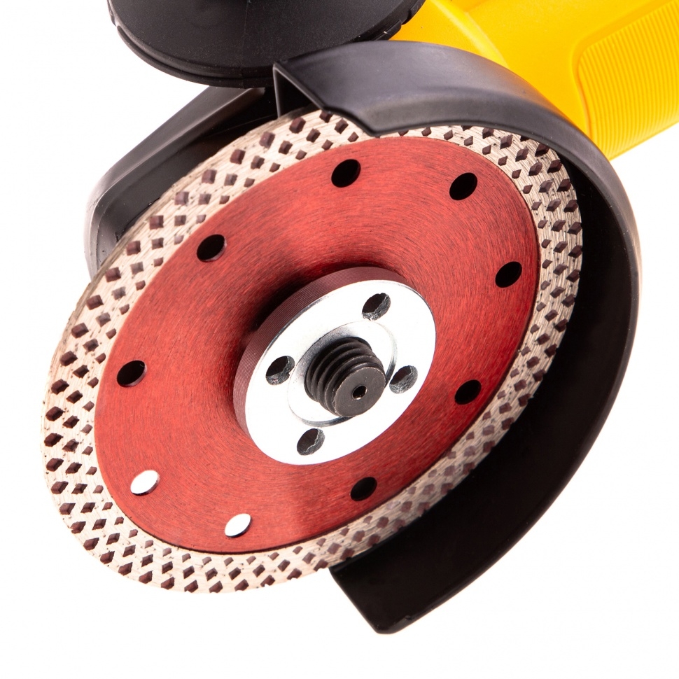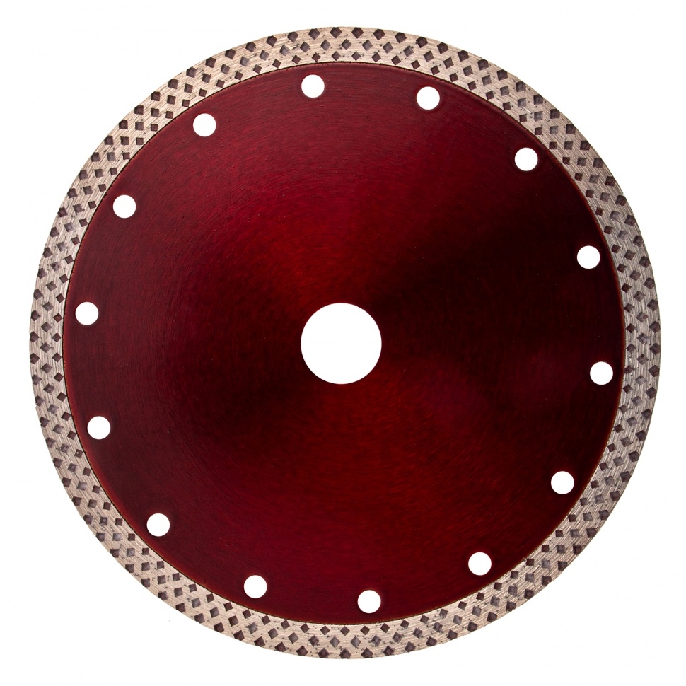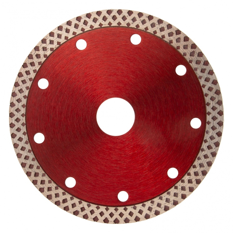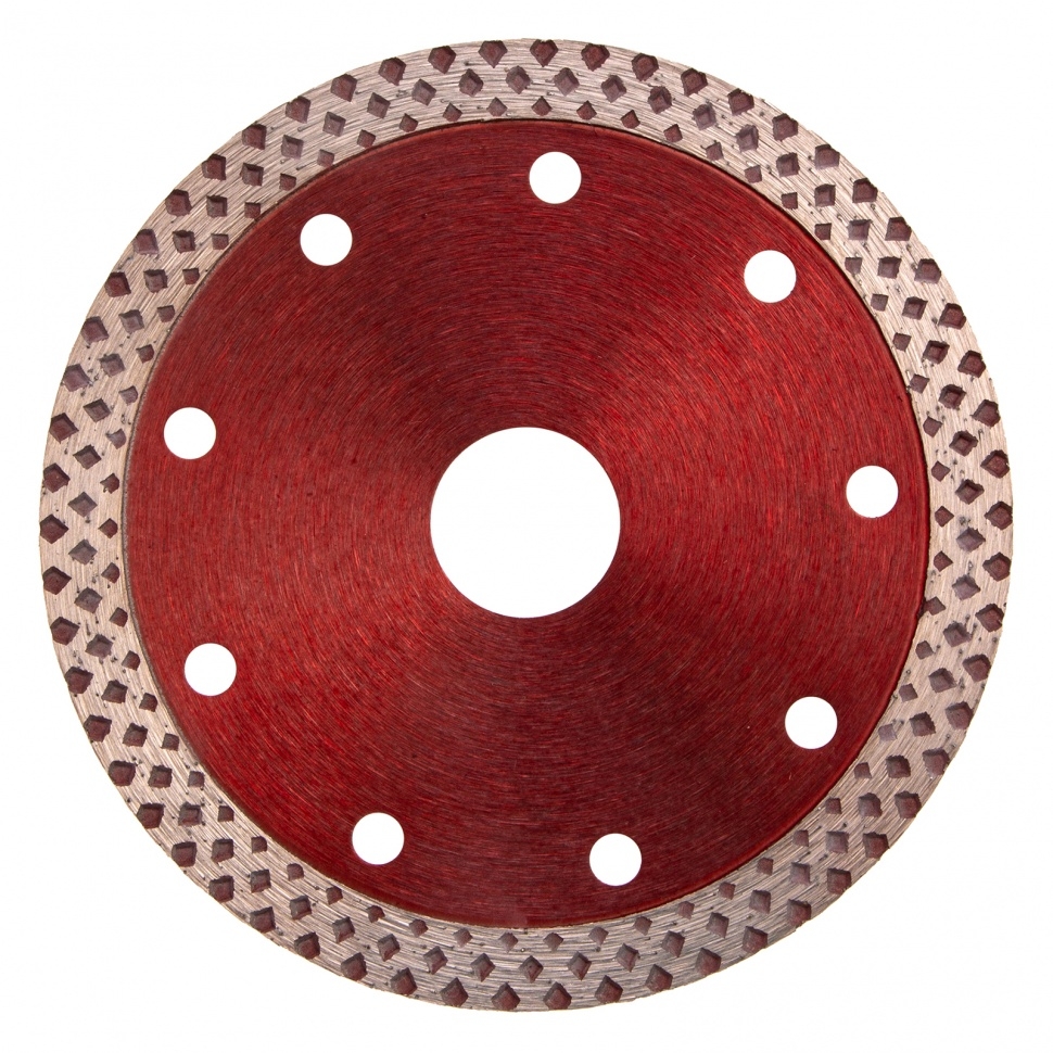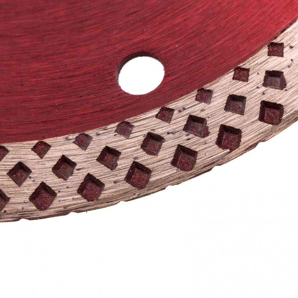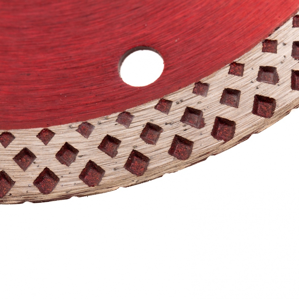 Отрезной алмазный диск Matrix 73122, сплошной, 115 мм &mdash оснастка для болгарок и плиткорезов с диаметром вала 22,2 мм. Он применяется для резки мрамора, искусственного и натурального камня, керамогранитной и керамической плитки. Использование без подачи воды расширяет возможности инструмента. Диск предназначен для бытового применения. Рекомендуется использовать водяное охлаждение для увеличения ресурса диска.Преимущества Благодаря высокой концентрации алмазов срез получается чистым и ровным. Режущая кромка шириной 10 мм способствует повышению производительности. Отверстия в корпусе диска способствуют активному охлаждению, что позволяет использовать диск для сухой резки. Диск выполнен нанесен методом холодного прессования, поэтому устойчив к механическим нагрузкам.