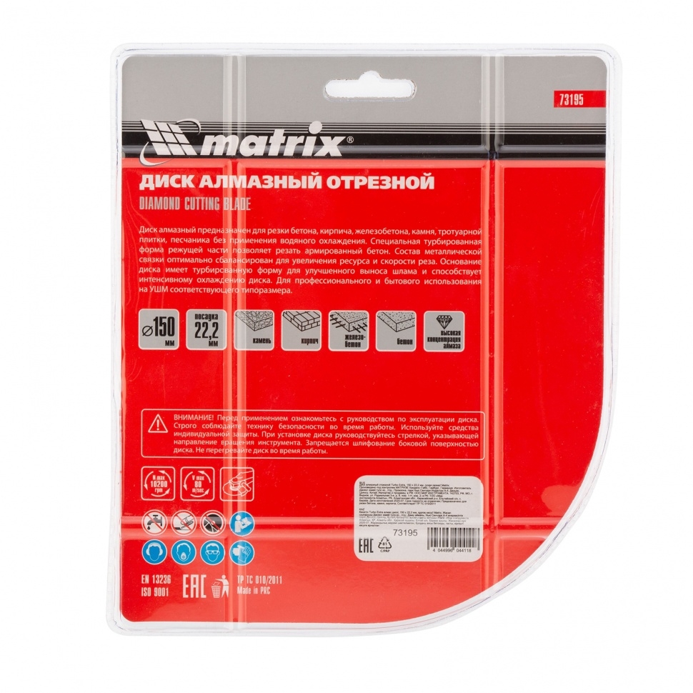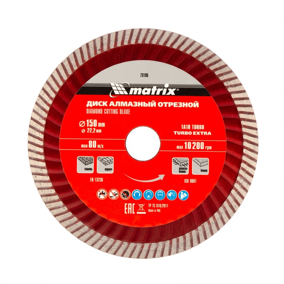 Отрезной алмазный диск Matrix Turbo Extra 73195, 150 х 22,2 мм, используется для сухой резки бетона, железобетона, кирпича, тротуарной плитки, шлакоблока и камня. Он устанавливается на углошлифовальные машины с посадочным диаметром 22,2 мм. Обеспечивает высокую скорость реза, поэтому подходит для интенсивного применения.Преимущества Экстратурбированная форма &mdash в процессе реза обеспечивается эффективное охлаждение и удаление шлама. Повышенная производительность &mdash рабочий слой шириной 7 мм состоит из синтетических алмазов высокого качества. Оптимально сбалансированный состав связки &mdash режущий слой равномерно стачивается, своевременно вскрывая новые алмазы. Эффективное решение бытовых и профессиональных задач &mdash концентрация алмазов повышена, диск рассчитан на долгую эксплуатацию.