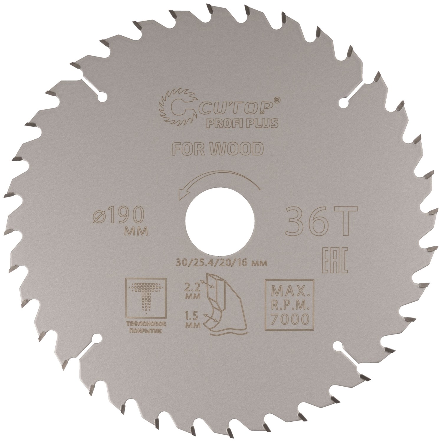 Диск пильный по дереву с тефл.покр.36Т CUTOP Profi Plus 190х1,5/2,2х30/25,4/20/16 мм