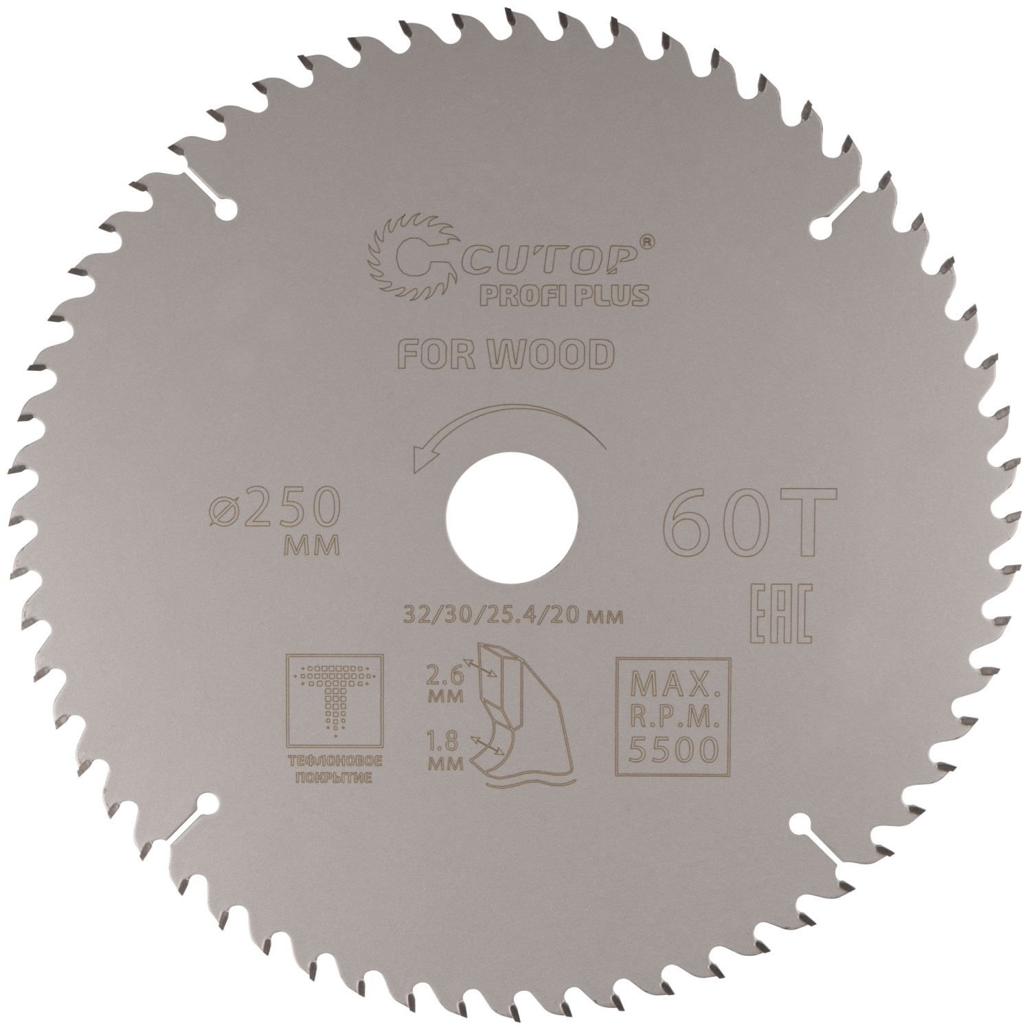 Диск пильный по дереву с тефл.покр.60Т CUTOP Profi Plus 250х1,8/2,6х32/30/25,4/20 мм