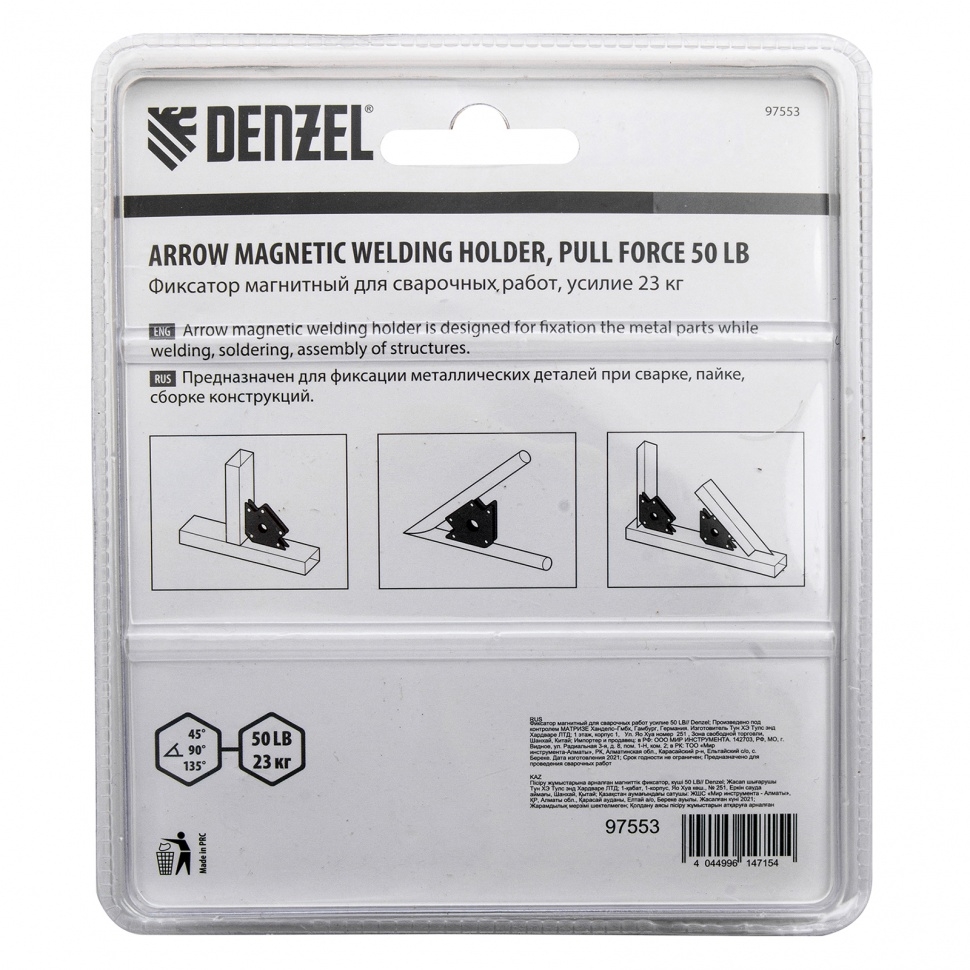 Магнитный фиксатор Denzel 50 LB - отличный помощник для фиксации металлических труб круглой и прямоугольной формы, профилей, листовых материалов, пластин, уголков и других типов металла при сварочных и паяльных работах. Он значительно экономит время мастера и надежно фиксирует конструкции весом до 23 кг под необходимым углом. С помощью фиксатора можно выстраивать конструкции под самыми востребованными углами: 45°, 90° или 135°.Магнит упрощает сварочный процесс - он не требует усилий в использовании и надежно держит выставленные детали.Стенки и корпус фиксатора не деформируются и не искривляются даже при падении или высоких нагрузках, что обеспечивает долгий срок службы инструмента.Габариты фиксатора 155 х 105 х 15 мм позволяют работать со средними или крупными металлическими элементами.Фиксатор не требует специального обслуживания, он быстро и легко чистится от сварочного налета щеткой.