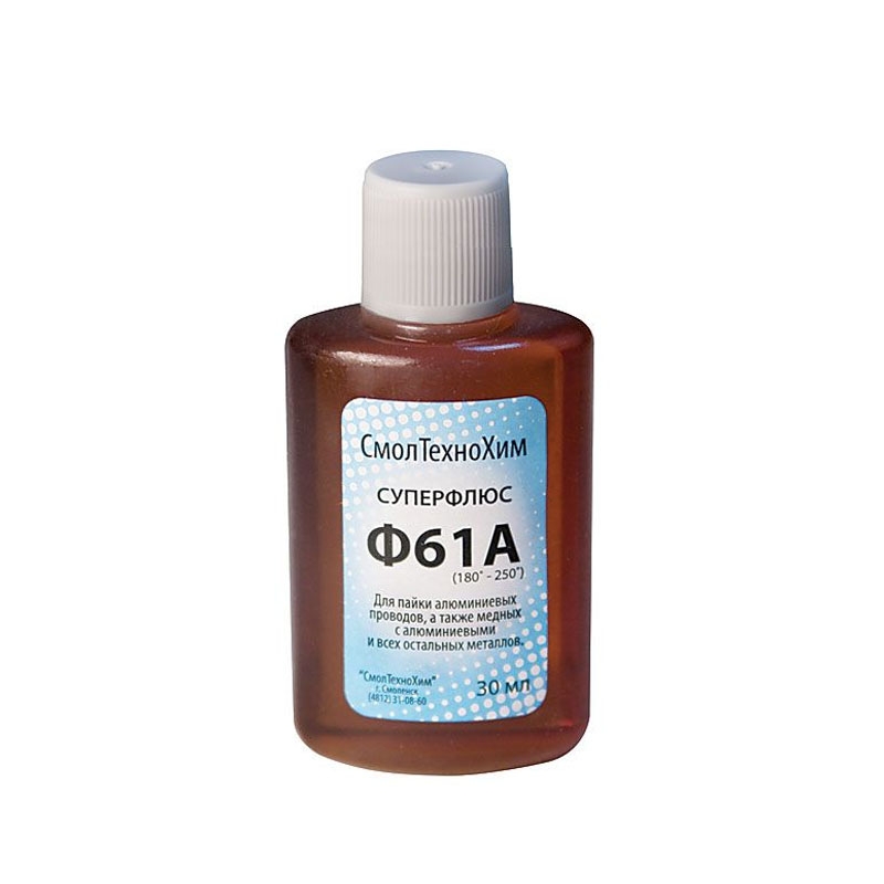 Флюс Ф-61А активный флюс для пайки алюминия, 30 мл предназначен для пайки алюминия и сплава АМЦ с медью и сталью припоями на основе олово-цинк и цинк-кадмий при t = 150 - 320° C. Удобный флакон с капельни-цей. Является более активным чем Ф-59А.