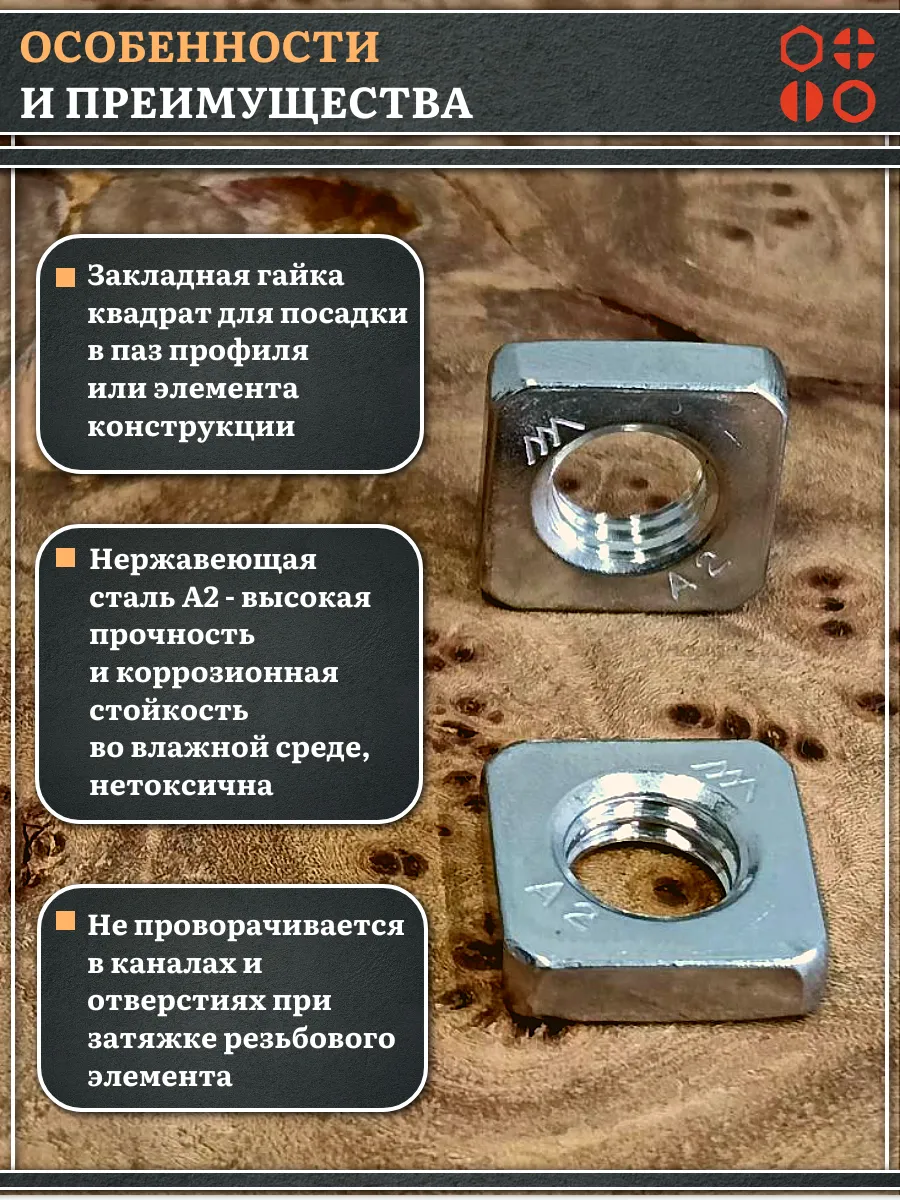 | Гайка квадратная М10 нержавеющая низкая DIN562, 10 шт. | 00-00000429ф10 | 1 шт. |