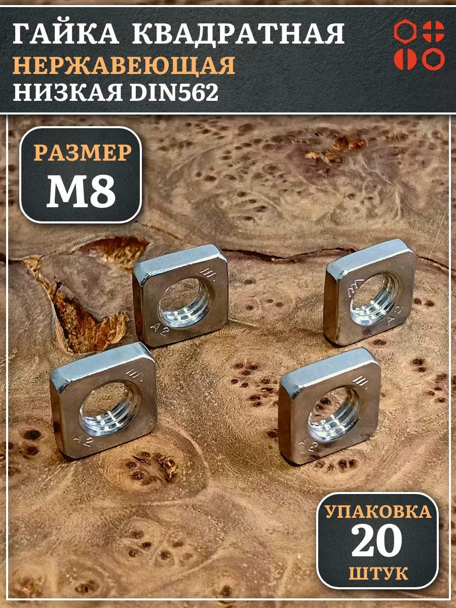 Гайка квадратная М8 нержавеющая низкая DIN562, 20 шт.