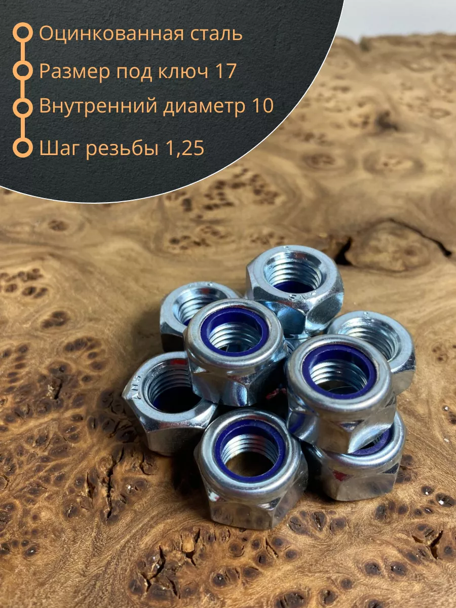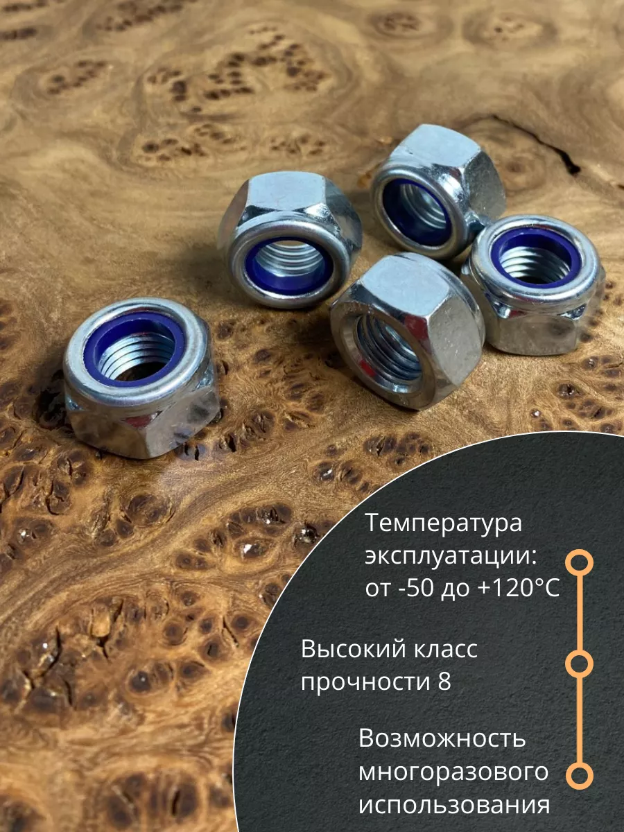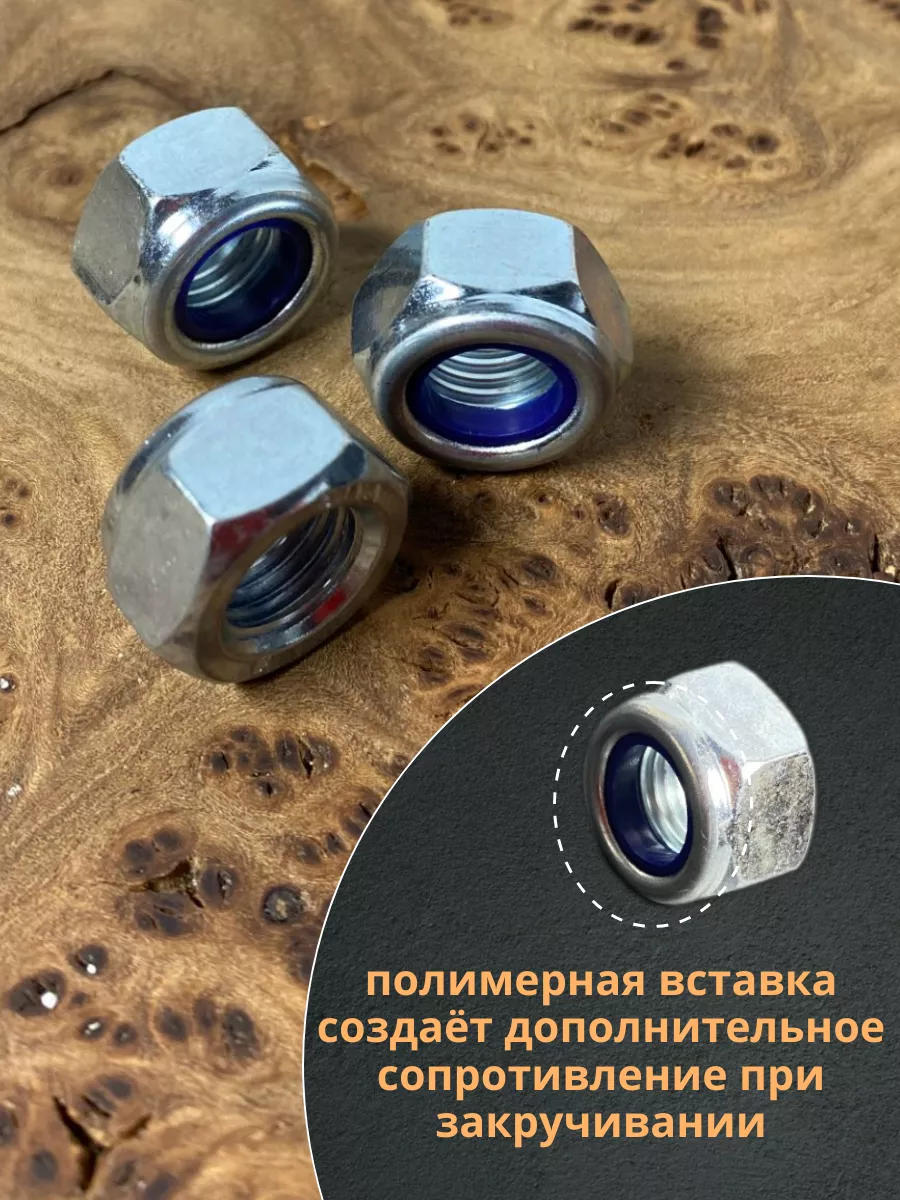 Гайка самоконтрящаяся с нейлоновым кольцом, низкая DIN 985 класса прочности 8 применяется в высокопрочных соединениях, испытывающих вибрационные нагрузки и склонных к самопроизвольному ослаблению или отвинчиванию. Она имеет шестигранную форму с кольцеобразным выступом с одной стороны, в паз которого вставлен вкладыш из полиамида – полимерный элемент защиты от непреднамеренного самоотвинчивания. Гайка самостопорящаяся высокопрочная идеально подходит для различных работ, связанных со сборкой и обслуживанием садовой и строительной техники, вибротрамбовок, зерносушилок, велосипедов, мотоциклов, мебели, навесов и других конструкций.