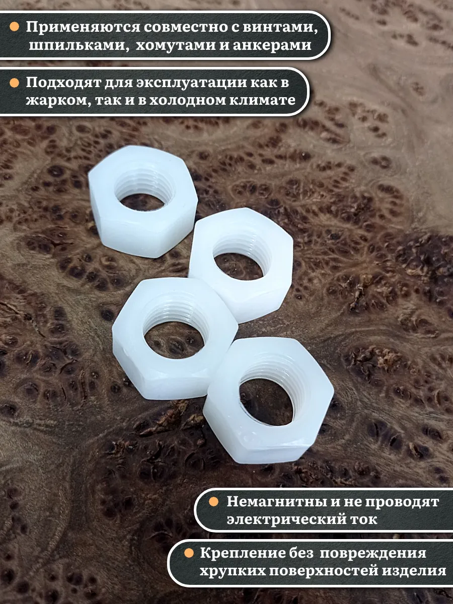 Гайки из пластика, изготовленные из полиамида и соответствующие стандарту DIN 934, используются для предотвращения самопроизвольного раскручивания резьбовых соединений. Вместе с ними применяют полиамидные шайбы, которые служат в качестве уплотнительной прокладки. Это позволяет увеличить площадь контакта и защитить соединяемые детали от повреждений.