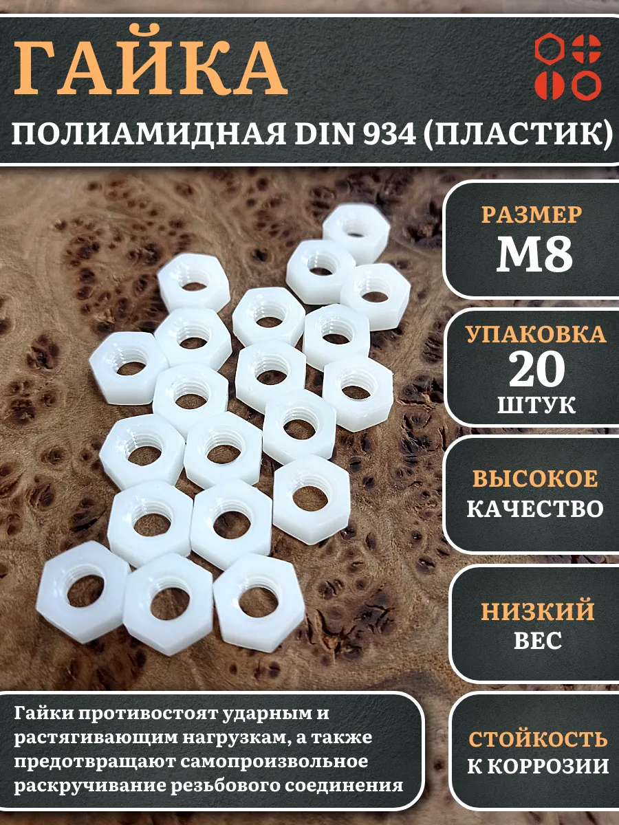Гайки из пластика, изготовленные из полиамида и соответствующие стандарту DIN 934, используются для предотвращения самопроизвольного раскручивания резьбовых соединений. Вместе с ними применяют полиамидные шайбы, которые служат в качестве уплотнительной прокладки. Это позволяет увеличить площадь контакта и защитить соединяемые детали от повреждений.