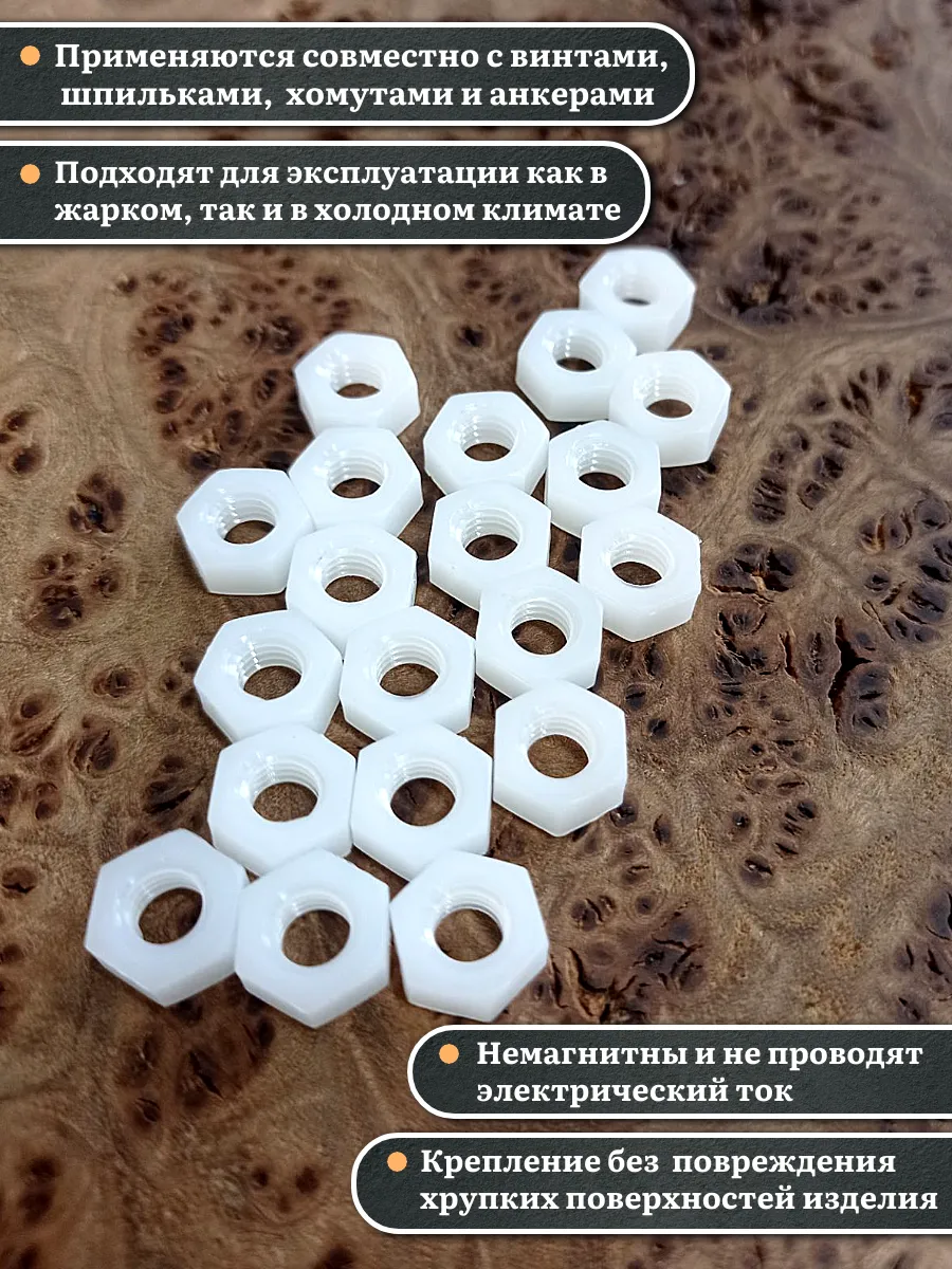 Гайки из пластика, изготовленные из полиамида и соответствующие стандарту DIN 934, используются для предотвращения самопроизвольного раскручивания резьбовых соединений. Вместе с ними применяют полиамидные шайбы, которые служат в качестве уплотнительной прокладки. Это позволяет увеличить площадь контакта и защитить соединяемые детали от повреждений.