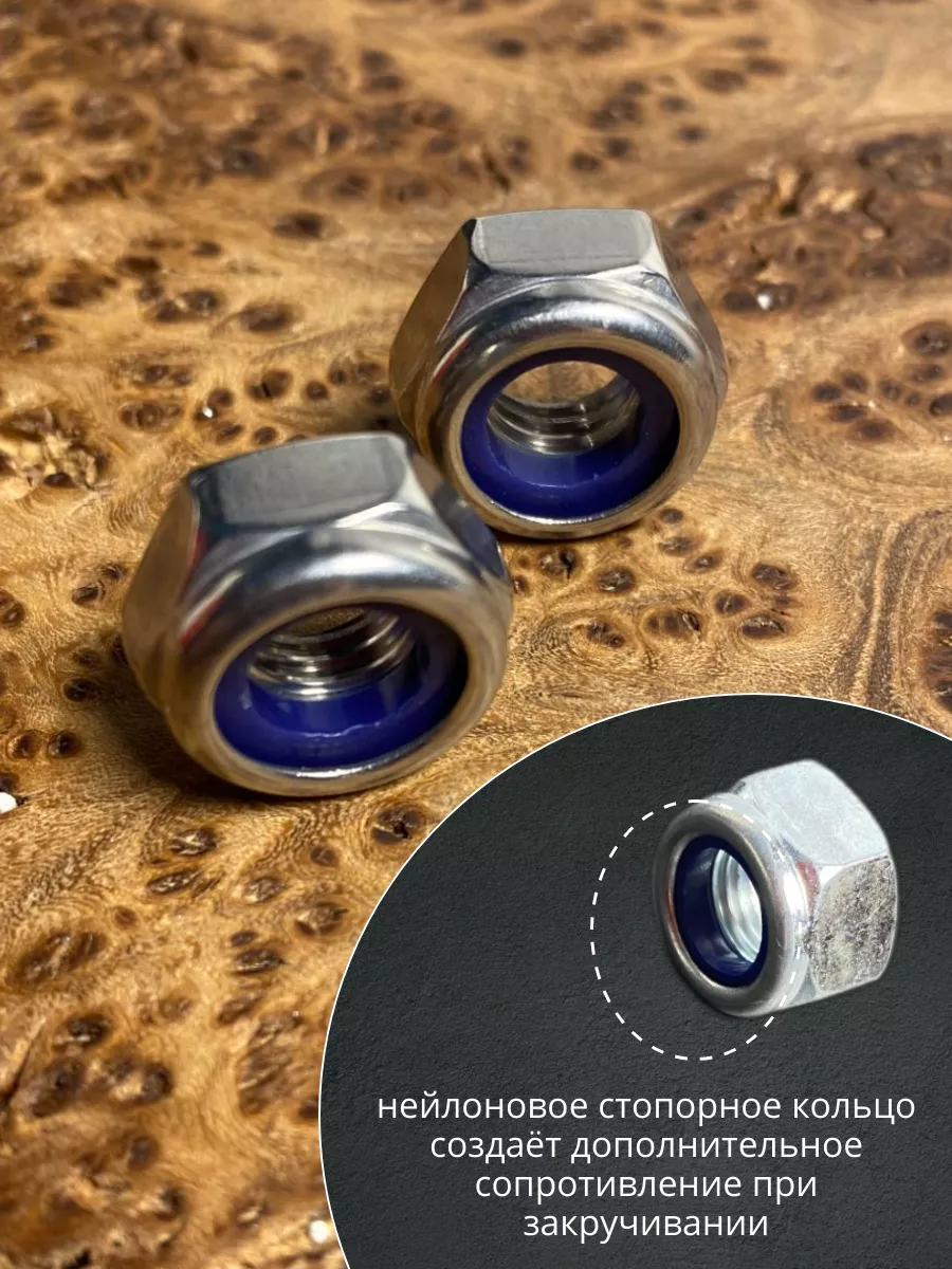 Стопорная самоконтрящаяся гайка DIN 985 с нейлоновым кольцом из нержавеющей стали А2 используется в машиностроении, приборостроении и прочих промышленных, производственных, строительных отраслях совместно с болтами, винтами или шпильками соответствующего размера резьбы.