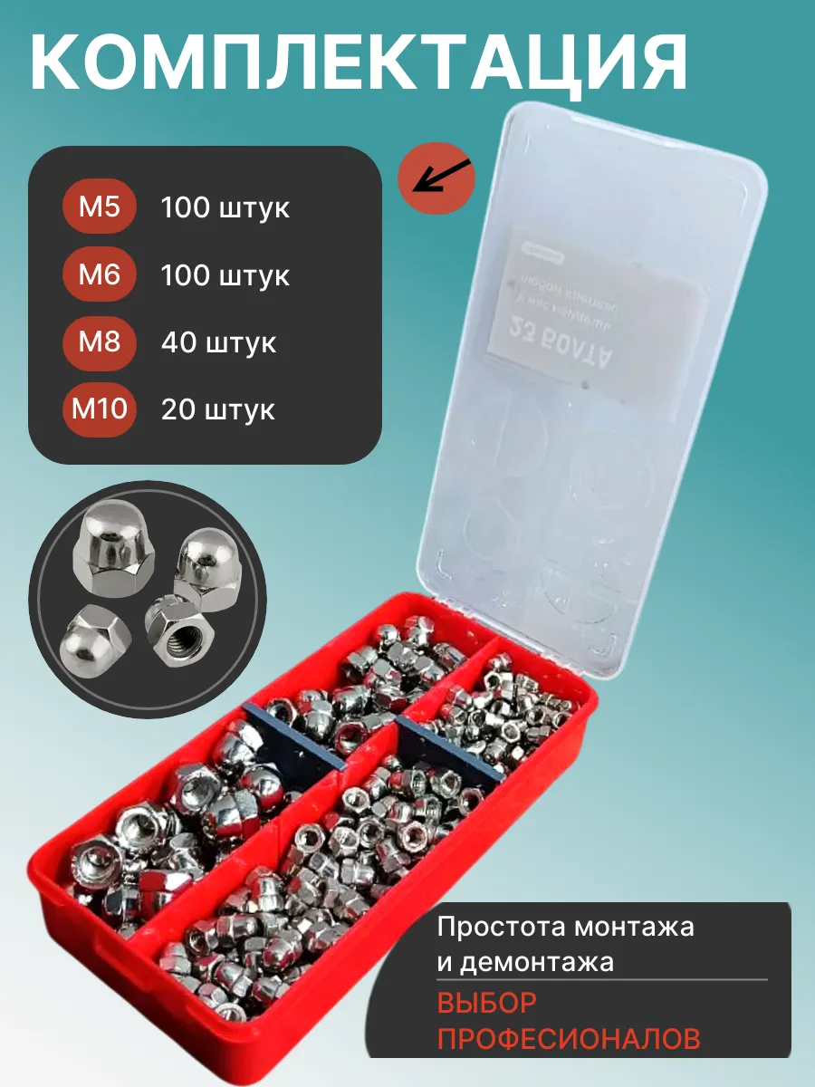 Гайки колпачковые нержавеющие М5,6,8,10 органайзер НАБОР 1