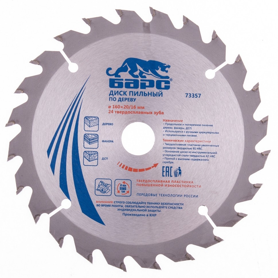 Пильный диск Барс 73357, ф160 х 20 мм, с 24 зубьями и кольцом 20/16 мм предназначен для быстрого пиления древесины мягких и твердых пород, ДСП, МДФ и фанеры. Тип зубьев АТВ и оптимально подобранный угол зуба позволяют производить как продольный, так и поперечный распил. Диск используется совместно с торцовочными и циркулярными пилами с посадкой 20 мм. В комплект входит переходное кольцо на диаметр 16 мм, расширяющее возможности применения оснастки. Диск подходит для интенсивной эксплуатации и может использоваться в профессиональной сфере. Повышенная износостойкость - пластины изготовлены из сплава YG8 твердостью свыше 88 HRА с добавлением легирующих компонентов, формирующих мелкозернистую структуру материала.