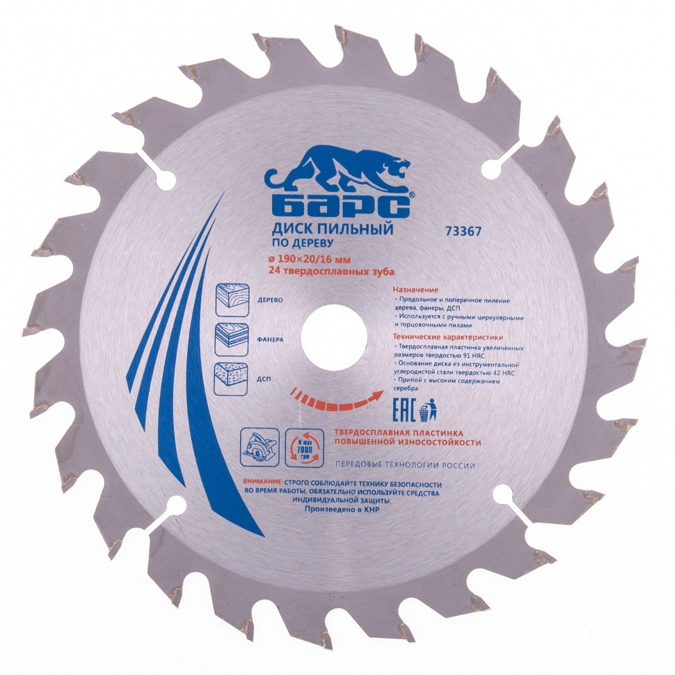 Диск пильный по дереву 190х20 мм 24 зуба + кольцо 20/16 мм Барс