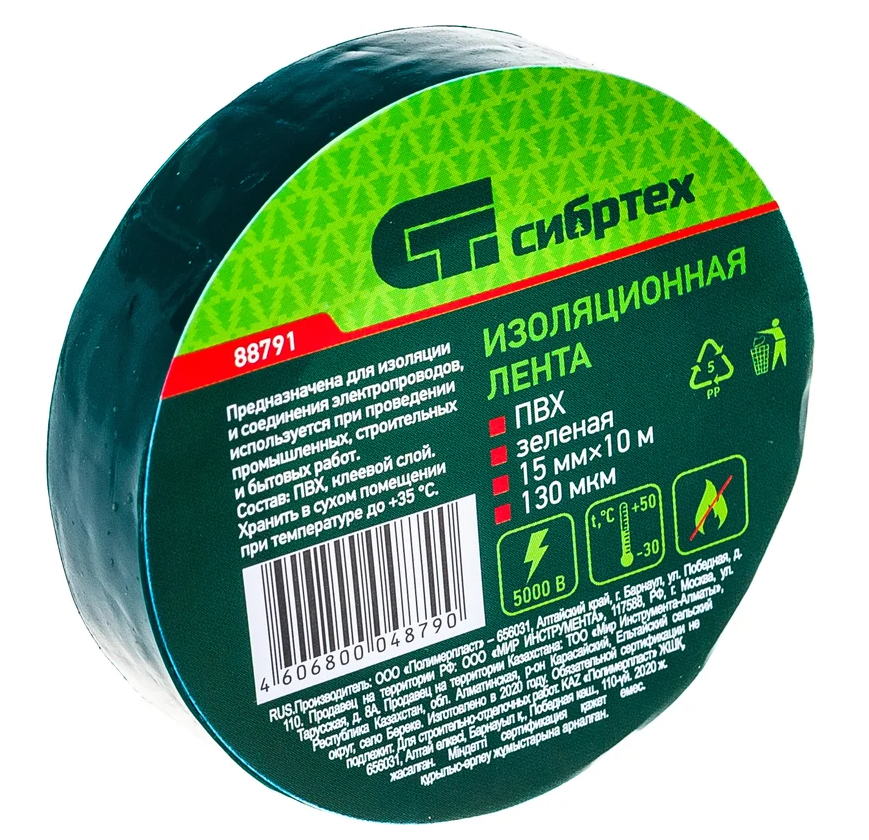 Изолента ПВХ 15 мм х 10 м (зеленая) Сибртех