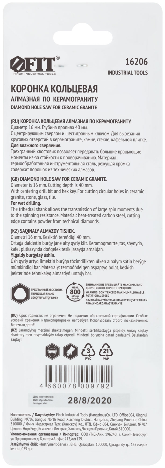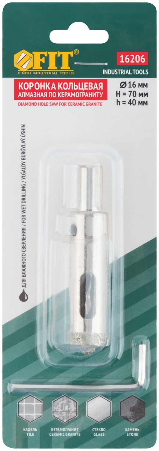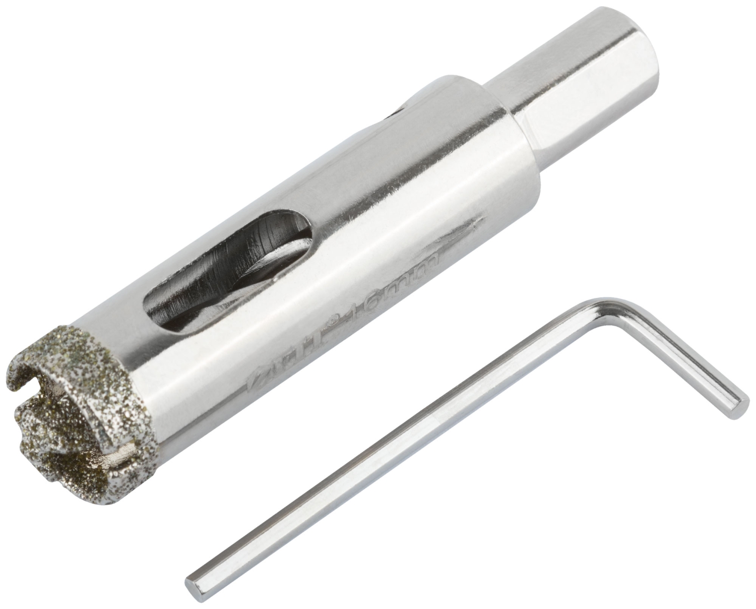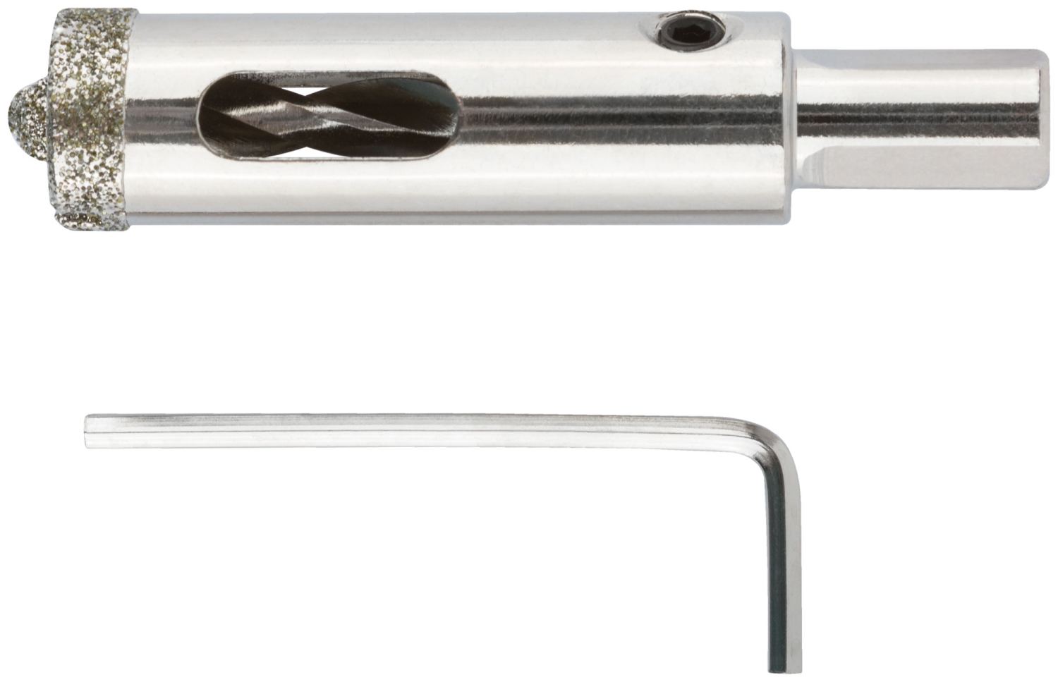 Трехгранный хвостовик. Идут в комплекте с центрирующим сверлом и шестигранным ключом. Для вырезания круговых отверстий в керамограните, камне, стекле, кафельной плитке. Влажное сверление. Глубина пропила 40 мм. Материал: инструментальная сталь, режущая кромка содержит порошок из технических алмазов. Упаковка: блистер.