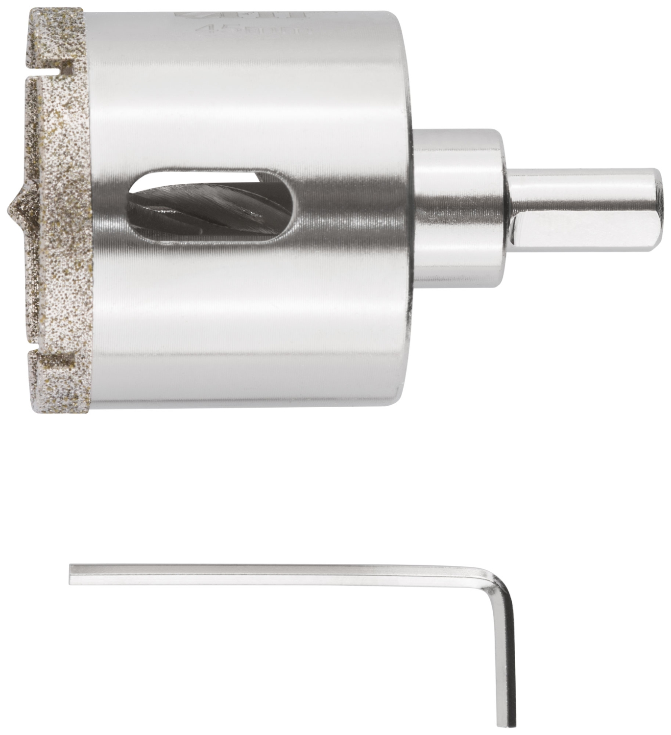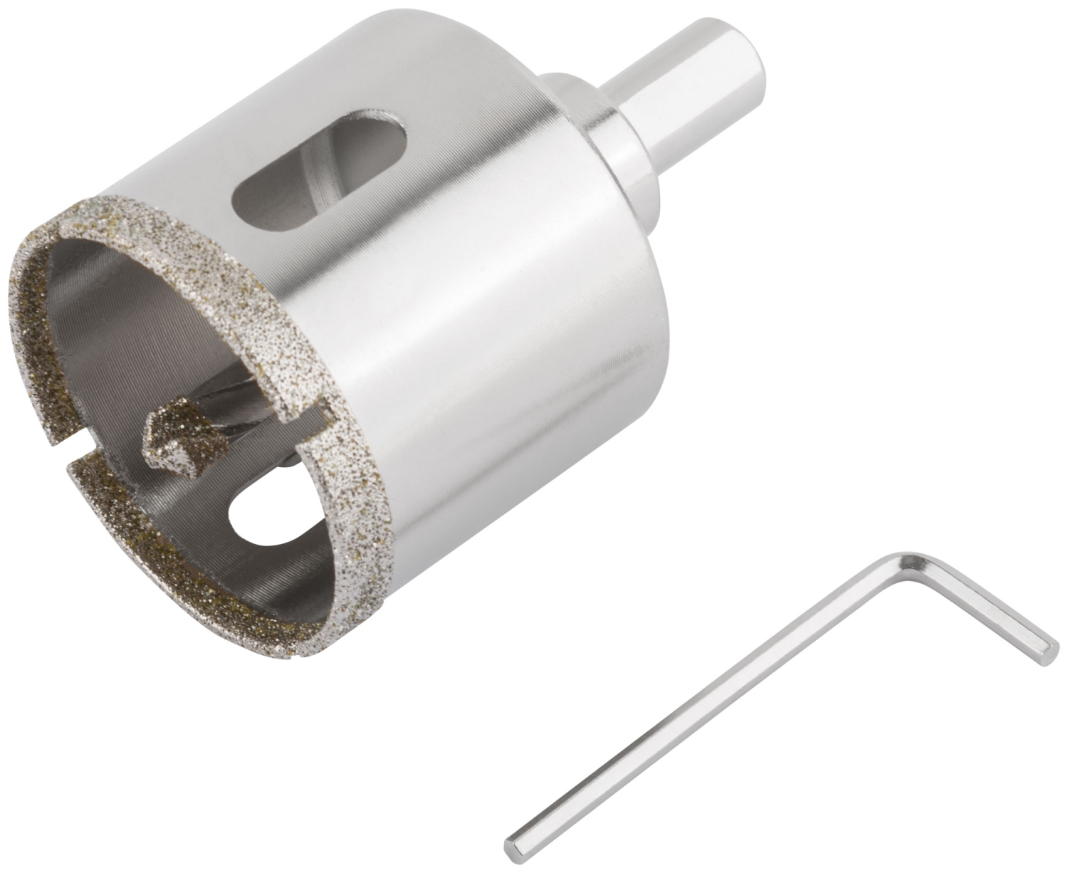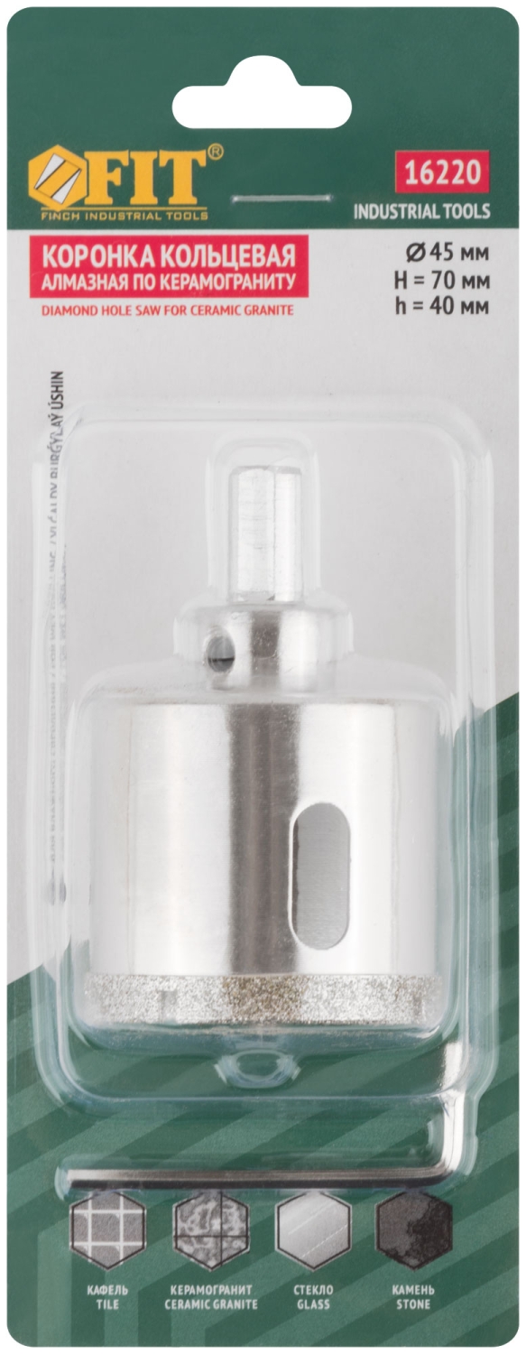 Трехгранный хвостовик. Идут в комплекте с центрирующим сверлом и шестигранным ключом. Для вырезания круговых отверстий в керамограните, камне, стекле, кафельной плитке. Влажное сверление. Глубина пропила 40 мм. Материал: инструментальная сталь, режущая кромка содержит порошок из технических алмазов. Упаковка: блистер.