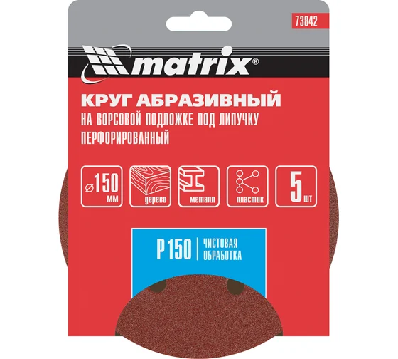 Абразивный круг на ворсовой подложке под «липучку» Matrix Р150 арт. 73842 используется для сухого чистового шлифования металла, дерева, пластика и других поверхностей. Круг устанавливается на эксцентриковые (орбитальные) шлифовальные машинки с отводом воздуха или на дрель с помощью опорной насадки Matrix. Среднезернистый абразив Р150 позволяет придать поверхности гладкость для дальнейшего нанесения лака, эмали и других материалов.