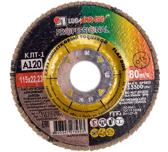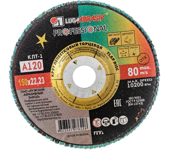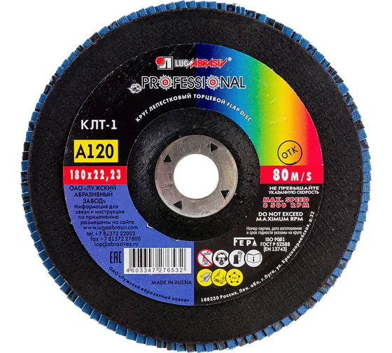 Круг лепестковый торцевой плоский КЛТ1 (180х22 мм; А120; 14А 12/Р120) Луга D91018022140120 предназначен для ручных шлифовальных машин. Применяется для плоского шлифования, обработки кромок и сварных швов деталей и конструкций из различных марок сталей, цветных металлов и древесины. Круг работает тихо, устойчиво, без прижогов, оставляя холодными обработанные поверхности, обеспечивает максимальный съем материала.