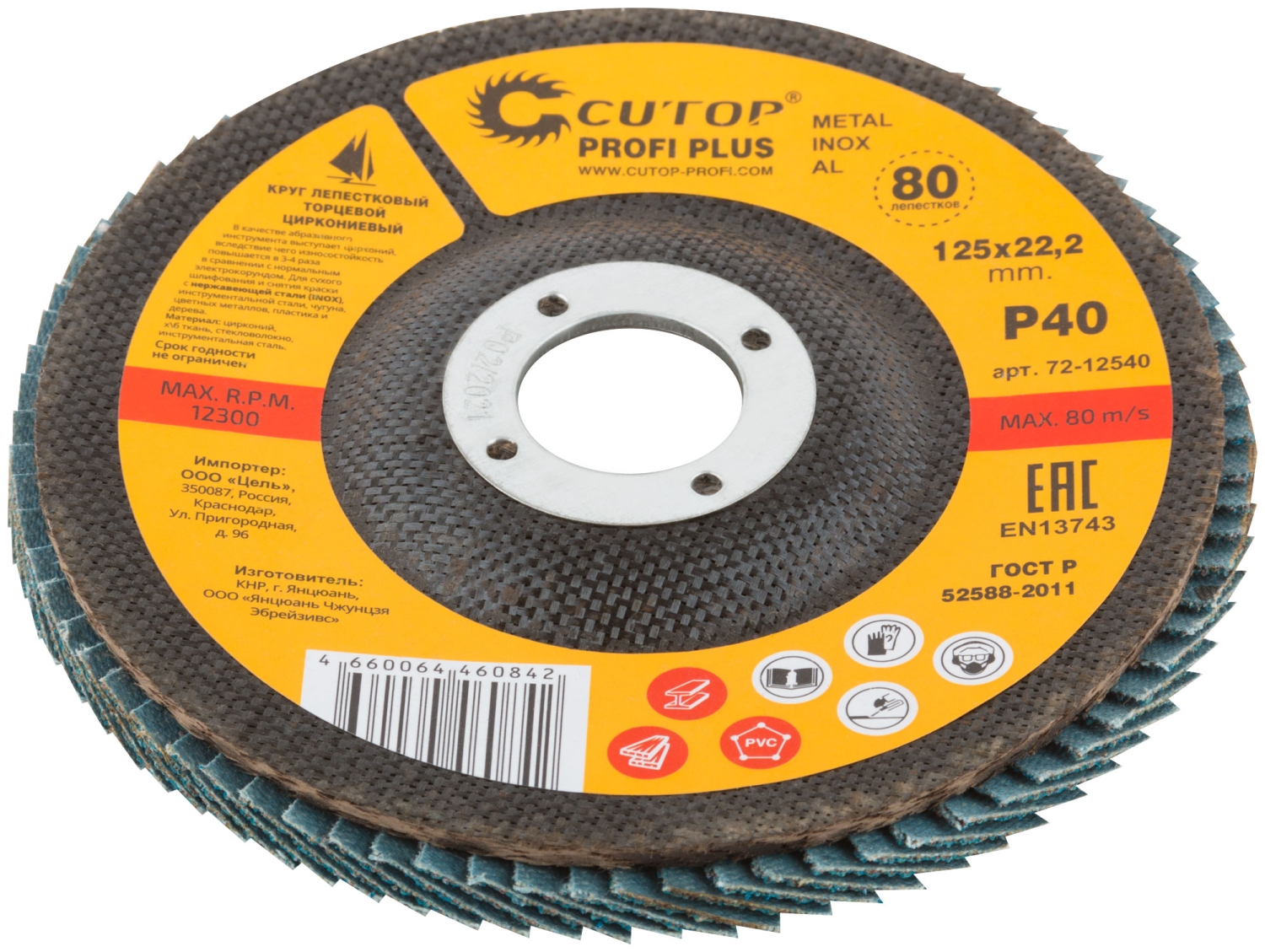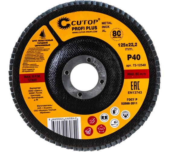 Круг лепестковый торцевой циркониевый Cutop Profi Plus (80 лепестков) 125х22,2 мм Р40 (CUTOP)