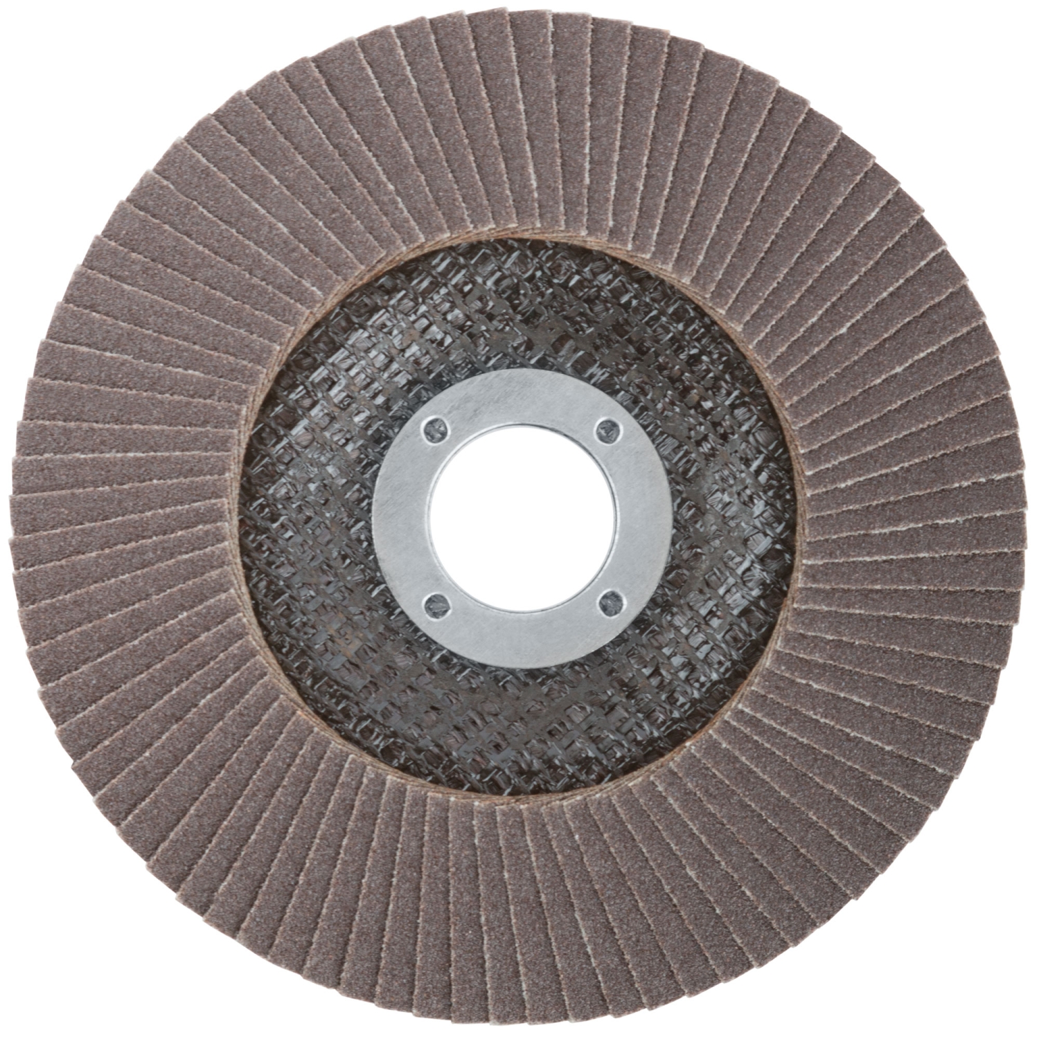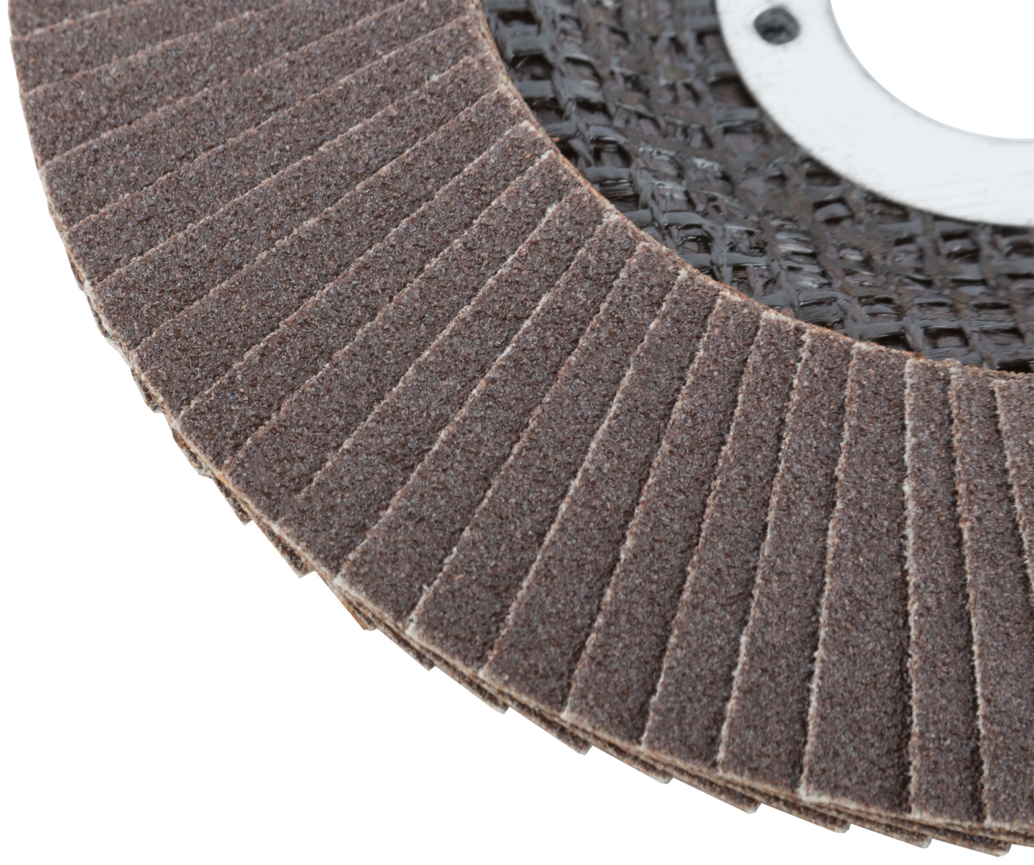 При изготовлении используется высококачественный гибкий абразивный материал состоящий из тканевой основы на которую нанесен слой кальцинированного оксида алюминия. Данный абразив имеет более твердые частицы, чем обычный оксид алюминия-Корунд, что позволяет увеличить скорость обрабатываемой поверхности до пяти раз. Наполняемость диска составляет 80 лепестков с углом наклона 10 градусов, что позволяет увеличить КПД круга и его стойкость к износу в несколько раз. Предназначен для обработки металла и нержавеющей стали. Для углошлифовальных машин. Посадочный диаметр 22,2мм.