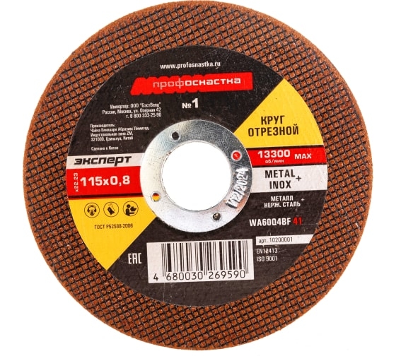 Отрезной круг №1 115*0,8*22 мм тип 41 ТМ Профоснастка предназначен для использования на УШМ. Обеспечивает мягкий рез и имеет высокий коэффициент шлифования (более 1,8) – показатель долговечности ресурса резания. Так же, с учетом цены отрезного диска и его ресурса, низкий показатель стоимости одного реза является наиболее выгодным для сравнения при интенсивном или индустриальном применении. Рекомендуется для резания углеродистых и нержавеющих сталей.