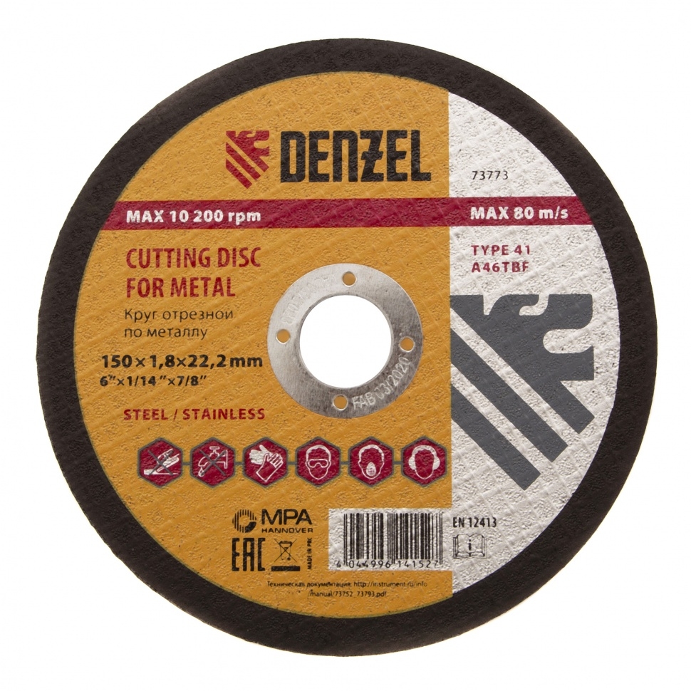 Отрезной круг по металлу Denzel A46TBF 73773, 150 х 1,8 х 22,2 мм, рассчитан на интенсивную работу с УШМ соответствующего типоразмера. Он универсален по своему применению и подходит для резки углеродистой и нержавеющей легированной стали. Круг можно использовать не только в быту, но и для решения профессиональных задач. Абразив из белого электрокорунда со специальными добавками эффективно режет материал без перегрева, в т.ч. нержавеющие стали, по сравнению с кругами из оксида алюминия. Благодаря толщине 1,8 мм и средней по плотности структуре круг обладает высокой износостойкостью и обеспечивает стабильность реза при больших объемах работ. Теплостойкая бакелитовая связка с упрочняющими элементами подобрана оптимально, не теряет своих свойств при нагреве, поэтому отлично удерживает абразив даже при интенсивных нагрузках. Усиленная стеклосетка придает кругу высокую прочность на разрыв, что повышает безопасность работы. Круг прошел контроль качества на каждом этапе производства.