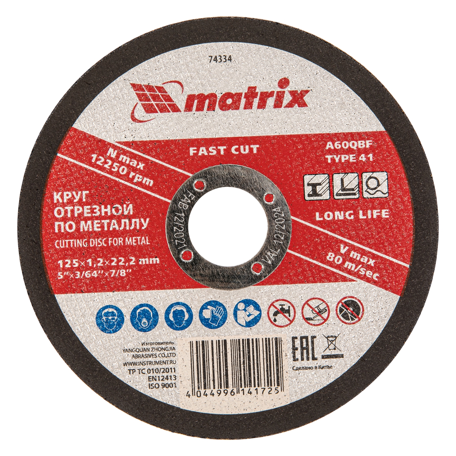 Отрезной круг по металлу Matrix A60QBF 74334, 125 х 1,2 х 22,2 мм, оптимально подходит для сухого реза углеродистых сталей. Он устанавливается на углошлифовальные машины с посадочным диаметром 22,2 мм. Круг рассчитан на бытовое использование в частной мастерской или гараже. Абразив из оксида алюминия с добавками обеспечивает высокую скорость реза и увеличивает ресурс круга.