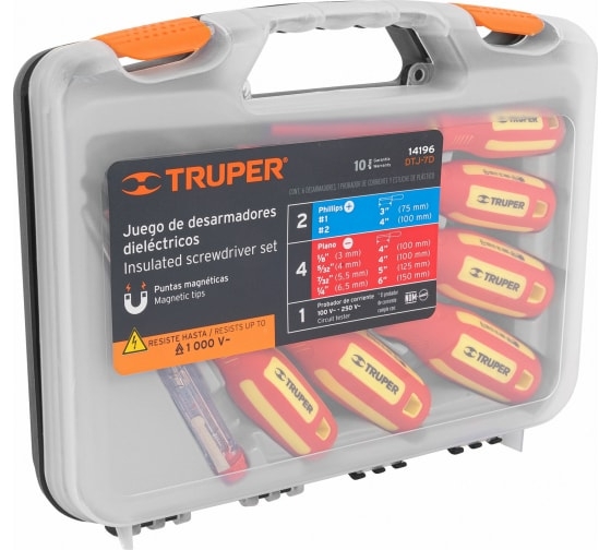 Набор диэлектрических отверток Truper DTJ-7D 7 предметов 14196 используется для работ с резьбовыми соединениями при ремонтных и монтажных работах. Благодаря диэлектрическому покрытию с инструментом можно работать под напряжением до 1000 В.