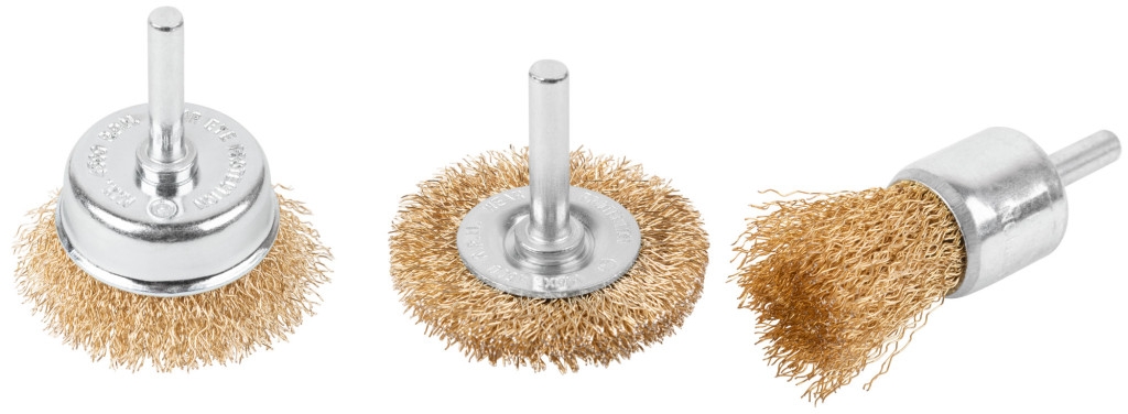 Набор щеток для дрели со шпильками, 2 «Чашки» (25 и 50 мм) и 1 «Плоская» 50 мм, латунированная витая проволока 0,3 мм, Cutop profi . Предназначена для мягкой качественной зачистки различных металлических и деревянных поверхностей, снятия ржавчины, удаления лакокрасочных покрытий и других загрязнений. Тип «Плоская» оптимально подходит для обработки углов, пазов, изгибов и других труднодоступных участков. Форма «Чашка» обеспечивает хорошую площадь прилегания к по- верхности. Упаковка: Блистер.