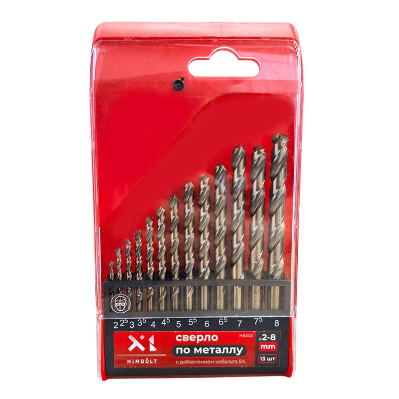 Набор сверл по металлу с кобальтом 5% P6M5K5 2-8(через 0,5) мм HIMBOLT 13 шт.пласт.бокс выполнен из высококачественной быстрорежущей инструментальной стали. Отличается повышенной красностойкостью и износостокойстью. Кобальт в составе сверла позволяет работать с любыми металлами и сплавами твердостью до 1100 МРА, а также с нержавеющей сталью, но при соблюдении рекомендованной скорости сверления и при использовании СОЖ.
