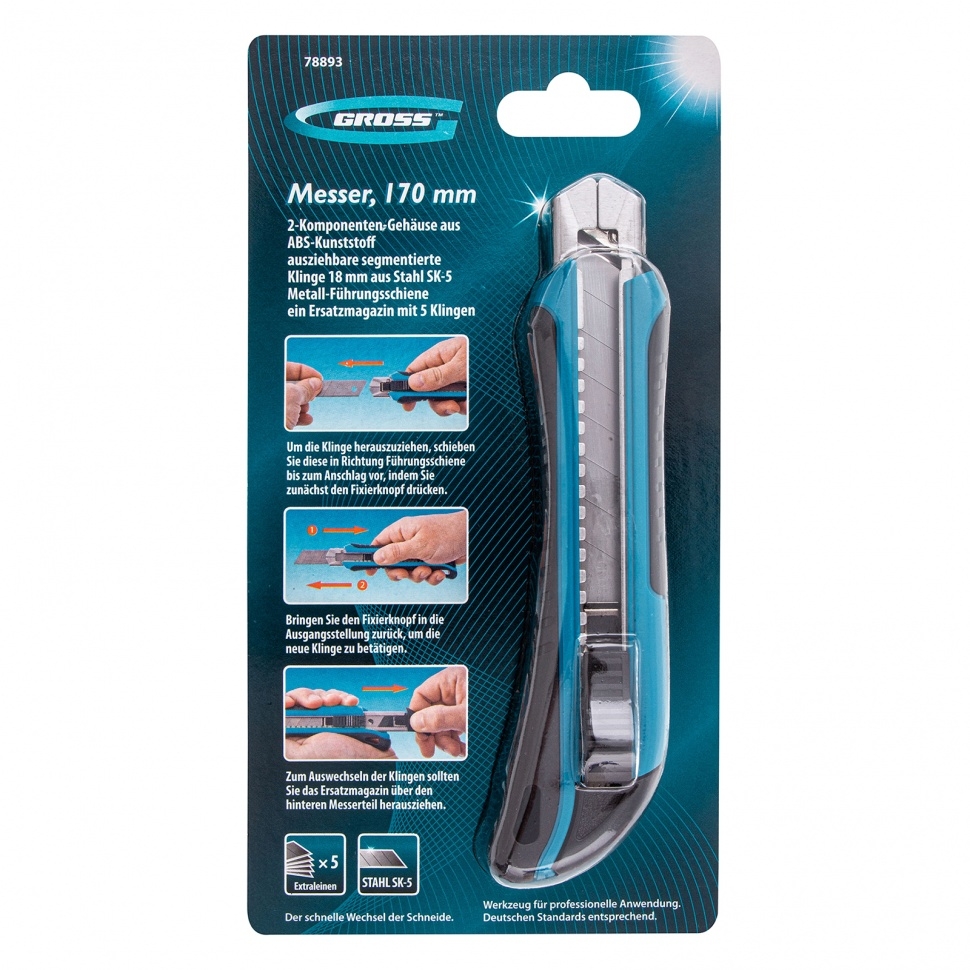 Нож 170 мм обрезиненный ABS-корпус,выдвижное сегментированное лезвие 18мм, 5 лезвий Gross