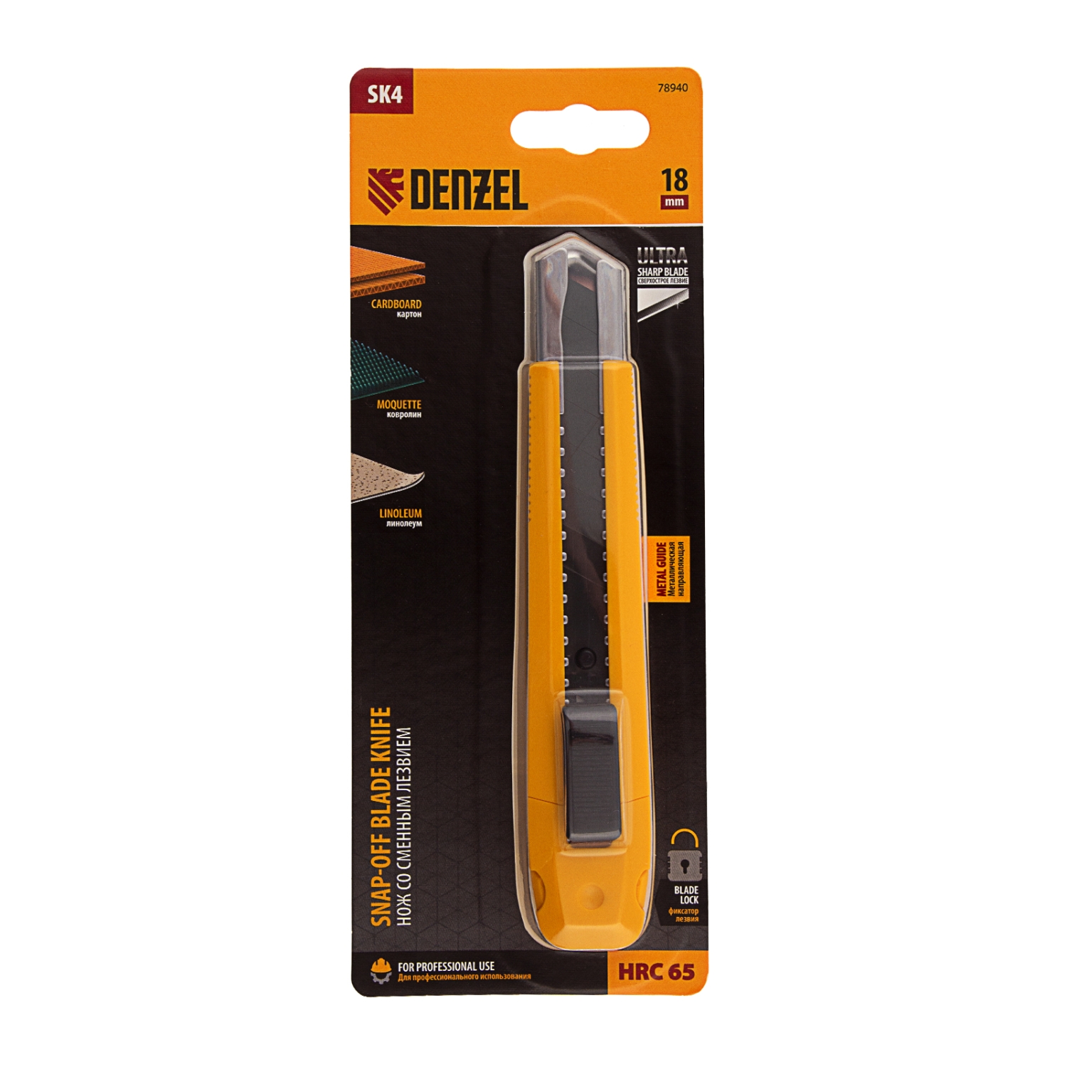Нож Denzel 78940 с выдвижным лезвием шириной 18 мм предназначен для резки линолеума, ковролина, бумаги, обоев, картона и других листовых материалов.Лезвие ножа изготовлено из высокоуглеродистой инструментальной японской стали SK-4, твердость режущей кромки- 65 HRC. Смена сегмента лезвия производится путем обламывания по линии насечки. Исползуйте шарнирно-губцевый инструмент, направляя нож в безопасную от себя сторону. При обламывании необходимо одевать средства индивидуальной защиты-очки, перчатки.