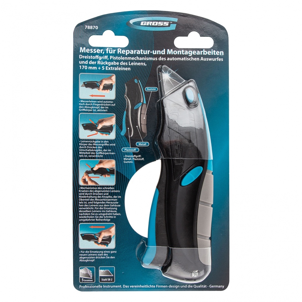 Ремонтно-монтажный нож пистолетного типа Gross 78870 длиной 170 мм, с трехкомпонентной рукояткой, автовыбросом/возвратом лезвия и 5 запасными лезвиями, применяется для разрезания линолеума, картона, кожи и других материалов. Лезвия изготовлены из высокопрочной японской стали SK-2, поэтому не ломаются и долго не тупятся. Инструмент предназначен для профессиональных работ, но может использоваться и в быту. Удобное использование — полотно выдвигается при нажатии на курок и фиксируется в рабочем положении, а для его возврата нужно нажать на кнопку.