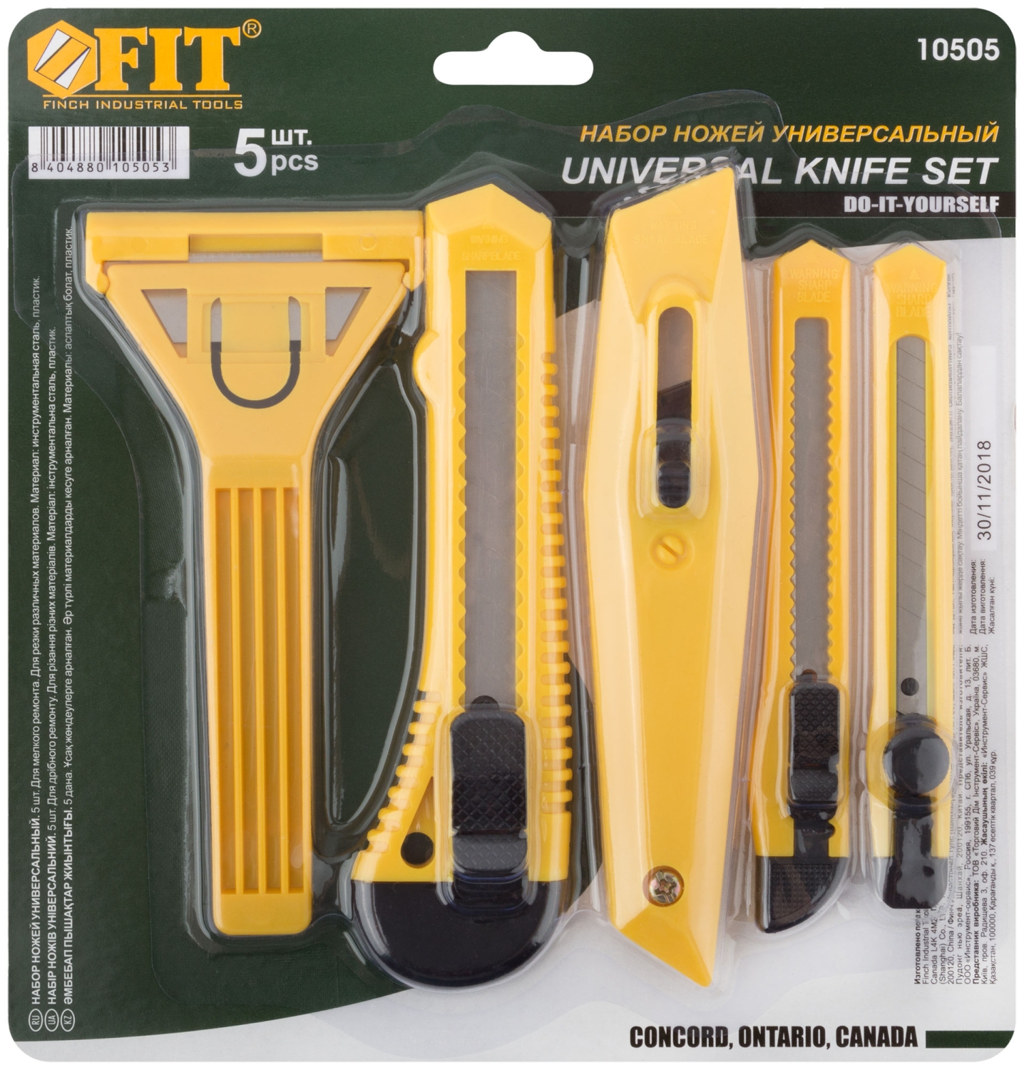 Набор многофункциональный. Для мелкого ремонта. В наборе: скребок стекольный, нож технический (b = 18 мм), нож для ленолиума с трапецивидным лезвием, пластмассовый корпус, нож технический (b = 9 мм) – 2 штуки. Материал: инструментальная сталь, пластик. Упаковка: блистер.