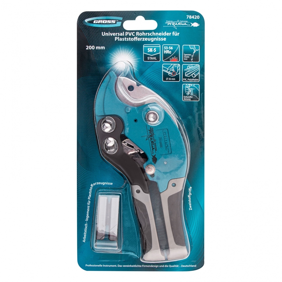 Ножницы для резки изделий из ПВХ Gross 78420 с двухкомпонентными рукоятками и рабочим столиком используются для работы с резиновыми шлангами и пластиковыми заготовками диаметром до 36 мм — трубами, плинтусами, профилем, галтелями, планками, рейками. Трапециевидное полотно с двумя рабочими кромками обеспечивает высокую производительность инструмента. Стол, устанавливаемый на опорную поверхность ножниц, позволяет резать плоские предметы. Инструмент рекомендован для профессионального применения. Рабочее полотно из высококачественной японской стали SK-5 отличается прочностью и износостойкостью.