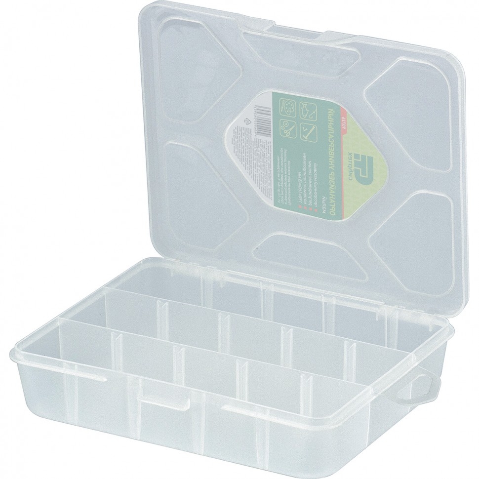 Универсальный малый органайзер Сибртех 90726 размером 190 х 160 х 45 мм, прозрачный матовый, используется для практичного хранения мелких предметов. Он подходит для распределения снастей, крепежа, хозяйственных мелочей и других предметов. Органайзер позволяет компактно расположить вещи в скрытых уголках квартиры: в шкафу, под кроватью и т.д. Преимущества Полипропиленовый корпус — вещи защищены от влаги и пыли. Полупрозрачное исполнение — не нужно открывать крышку, чтобы увидеть содержимое органайзера. Переставные перегородки — размер ячеек можно регулировать для сортировки мелких и больших предметов.