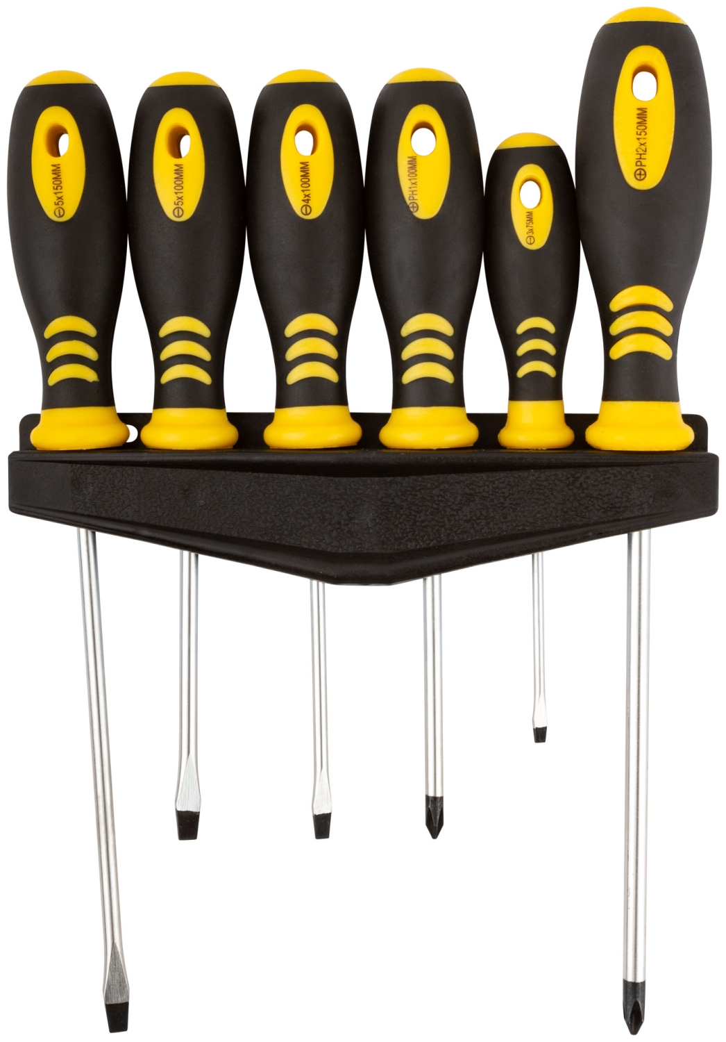 «Хард». Набор 6 шт. на пластиковом держателе. Отвёртки: PH 1x100, PH 2x150, SL 3x75, SL 4x100, SL 5x100, SL 5x150. Материал: жало из хром-ванадиевой стали, магнитный наконечник, прорезиненная ручка. Упаковка: блистер.