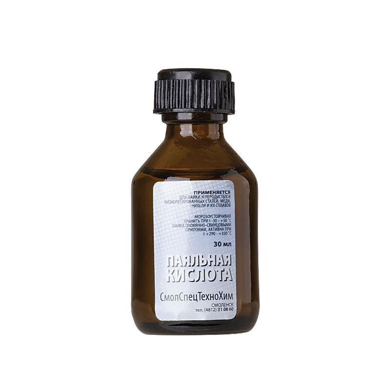 Высокоактивный флюс на основе хлористых солей цинка. Для пайки и лужения стали, чугуна, латуни, железа, бронзы, меди, никеля, серебра и др. Удобный флакон с капельницей.
