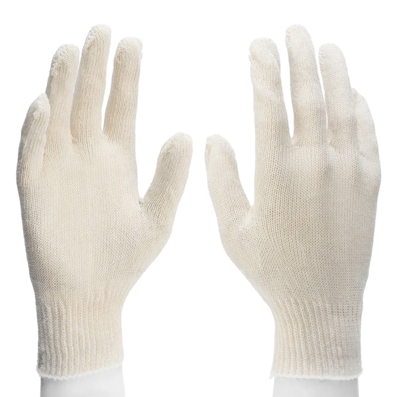 Перчатки трикотажные, 10 класс вязки, Россия будут полезны на строительной площадке, в саду, сборочном цеху. За счет высокой плотности они защищают руки от появления мозолей, царапин и загрязнения. В то же время перчатки обеспечивают свободу движений и тактильность пальцев, что позволяет проводить точные работы. Преимущества Хлопчатобумажная ткань с добавлением полиэфирной нити хорошо пропускает воздух, не вызывает аллергической реакции и приятна на ощупь, поэтому в перчатках комфортно работать. Перчатки легко очищаются и не разрушаются при машинной стирке, поэтому их можно использовать много раз. Эластичные манжеты надежно фиксируют перчатки на запястье, предотвращая их соскальзывание.